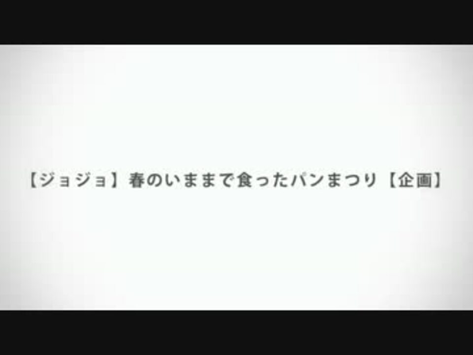 <font size="4"><b><br />ある視聴者がブラウザの窓から動画を眺めたとさ。<br />一人は一部を見た。一人は二部を見た。<br /><br />我われはこのタグを知っている!<br />いや!<br />この企画とこの讃歌動画を知っている!<br /><br />次にお前は「待ってました」と言うッ!</b></font><br /><br /><br /><a href="#" class="seekTime" data-seekTime="1:38" onclick="seekNicoPlayer('#1:38'); return false;">#1:38</a> ジョジョの奇妙なMAD/音MAD/手描きジョジョ<br /><a href="#" class="seekTime" data-seekTime="5:01" onclick="seekNicoPlayer('#5:01'); return false;">#5:01</a> 作ってみた<br /><a href="#" class="seekTime" data-seekTime="5:50" onclick="seekNicoPlayer('#5:50'); return false;">#5:50</a> ジョジョの奇妙なMMD<br /><a href="#" class="seekTime" data-seekTime="10:57" onclick="seekNicoPlayer('#10:57'); return false;">#10:57</a> ジョジョの奇妙なソング集-歌ってみて<br /><a href="#" class="seekTime" data-seekTime="14:06" onclick="seekNicoPlayer('#14:06'); return false;">#14:06</a> ジョジョの奇妙なソング集-歌ってみた<br /><a href="#" class="seekTime" data-seekTime="21:00" onclick="seekNicoPlayer('#21:00'); return false;">#21:00</a> 静画<br /><br />ジョジョ企画「今まで食ったパンまつり」讃歌作品一覧→<a href="https://www.nicovideo.jp/mylist/36607471" target="_blank" rel="noopener">mylist/36607471</a><br /><br />
