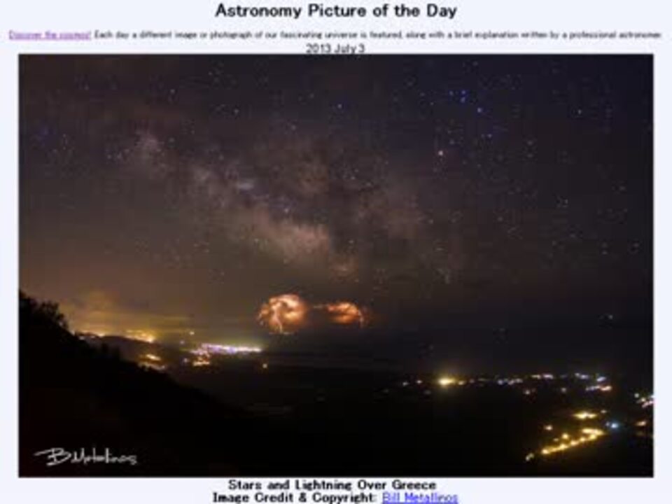 2013年 7月3日 Astronomy Picture of the Day - Stars and Lightning Over Greece 「ギリシャの星と雷」です。APODとはNASAの天文学者が、毎日天文に関する画像に説明を添えて公開しているサイトです。英語の勉強に読んでます。間違いがあれば指摘頂けると嬉しいです。美しい写真と原文:<a href="http://apod.nasa.gov/apod/ap130703.html" target="_blank" rel="noopener nofollow">http://apod.nasa.gov/apod/ap130703.html</a> お借りした素材:Wikipedia「Milchstraße」より"ESO - Milky Way" by ESO/S. Brunier,Flickrより"Cat hiding from the rain" by L4urenZ お借りした音源:<a href="https://commons.nicovideo.jp/works/nc27172" target="_blank" rel="noopener">nc27172</a>「リトルハンバーグ」 by 早慶 APODreadingマイリスト <a href="https://www.nicovideo.jp/mylist/38905578" target="_blank" rel="noopener">mylist/38905578</a>(2013年7月分) (<a href="https://www.nicovideo.jp/watch/sm21274823" class="watch">sm21274823</a><前日 翌日><a href="https://www.nicovideo.jp/watch/sm21291828" class="watch">sm21291828</a>)twitter:Cc_jabberwock 転載はご遠慮下さい。解らない事が有ったら気軽にお尋ね下さい。解る範囲内ですがお答えします