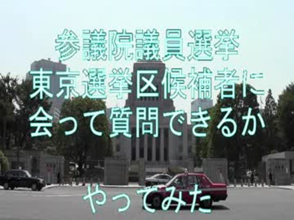ほんのすこしでも投票の参考になればと候補者に会って質問できるかやってみた結果です。<br>拙い動画で本当にすいません......。<br>大河原まさこ<a href="#" class="seekTime" data-seekTime="2:24" onclick="seekNicoPlayer('#2:24'); return false;">#2:24</a>/釈量子<a href="#" class="seekTime" data-seekTime="2:48" onclick="seekNicoPlayer('#2:48'); return false;">#2:48</a>/中松義郎<a href="#" class="seekTime" data-seekTime="3:00" onclick="seekNicoPlayer('#3:00'); return false;">#3:00</a>/松本みのる<a href="#" class="seekTime" data-seekTime="3:12" onclick="seekNicoPlayer('#3:12'); return false;">#3:12</a>/まるこ安子<a href="#" class="seekTime" data-seekTime="3:24" onclick="seekNicoPlayer('#3:24'); return false;">#3:24</a>/山口なつお<a href="#" class="seekTime" data-seekTime="4:42" onclick="seekNicoPlayer('#4:42'); return false;">#4:42</a>/たけみ敬三<a href="#" class="seekTime" data-seekTime="5:00" onclick="seekNicoPlayer('#5:00'); return false;">#5:00</a>/小倉淳<a href="#" class="seekTime" data-seekTime="5:48" onclick="seekNicoPlayer('#5:48'); return false;">#5:48</a>/丸川珠代<a href="#" class="seekTime" data-seekTime="7:31" onclick="seekNicoPlayer('#7:31'); return false;">#7:31</a>/吉良よし子<a href="#" class="seekTime" data-seekTime="7:43" onclick="seekNicoPlayer('#7:43'); return false;">#7:43</a>/マタヨシ光雄<a href="#" class="seekTime" data-seekTime="9:50" onclick="seekNicoPlayer('#9:50'); return false;">#9:50</a>/桐島ローランド<a href="#" class="seekTime" data-seekTime="10:20" onclick="seekNicoPlayer('#10:20'); return false;">#10:20</a>/マック赤坂<a href="#" class="seekTime" data-seekTime="10:32" onclick="seekNicoPlayer('#10:32'); return false;">#10:32</a>/すずきかん<a href="#" class="seekTime" data-seekTime="10:56" onclick="seekNicoPlayer('#10:56'); return false;">#10:56</a>/鈴木信行<a href="#" class="seekTime" data-seekTime="11:08" onclick="seekNicoPlayer('#11:08'); return false;">#11:08</a>/森純<a href="#" class="seekTime" data-seekTime="12:28" onclick="seekNicoPlayer('#12:28'); return false;">#12:28</a>/犬丸勝子<a href="#" class="seekTime" data-seekTime="12:39" onclick="seekNicoPlayer('#12:39'); return false;">#12:39</a>/山本太郎<a href="#" class="seekTime" data-seekTime="12:51" onclick="seekNicoPlayer('#12:51'); return false;">#12:51</a>/中村高志<a href="#" class="seekTime" data-seekTime="14:40" onclick="seekNicoPlayer('#14:40'); return false;">#14:40</a>/西野貞吉<a href="#" class="seekTime" data-seekTime="14:52" onclick="seekNicoPlayer('#14:52'); return false;">#14:52</a>(届け出順)<br>後の動画「2014衆院選」<a href="https://www.nicovideo.jp/watch/sm19560813" class="watch">sm19560813</a>「2014都知事選」<a href="https://www.nicovideo.jp/watch/sm22782198" class="watch">sm22782198</a><br>過去動画「2013都議選」<a href="https://www.nicovideo.jp/watch/sm21156698" class="watch">sm21156698</a>「2012衆議院」<a href="https://www.nicovideo.jp/watch/sm19560813" class="watch">sm19560813</a><br>「福生関連の選挙情報などのブログ」<a href="http://xxx000nabe000xxx.blog.jp/" target="_blank" rel="noopener nofollow">http://xxx000nabe000xxx.blog.jp/</a><br>「Twitter」<a href="https://twitter.com/nabe_yattemita" target="_blank" rel="noopener nofollow">https://twitter.com/nabe_yattemita</a>