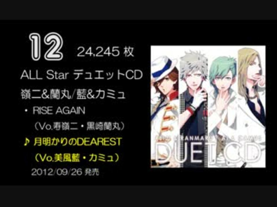 うたプリのシングル(声優名義は除外)の2013年8月時点での累計枚数<br /><br />[Aクラス] 一十木音也(寺島拓篤)/聖川真斗(鈴村健一)/四ノ宮那月(谷山紀章)<br />[Sクラス] 一ノ瀬トキヤ(宮野真守)/神宮寺レン(諏訪部順一)/来栖翔(下野紘)<br />愛島セシル(鳥海浩輔)/寿嶺二(森久保祥太郎)/黒崎蘭丸(鈴木達央)/美風藍(蒼井翔太)/カミュ(前野智昭)<br /><br />・アルバムランキング→<a href="https://www.nicovideo.jp/watch/sm21359606" class="watch">sm21359606</a><br />・シングルランキング【10~1位】→<a href="https://www.nicovideo.jp/watch/sm22081162" class="watch">sm22081162</a><br />・<a href="https://www.nicovideo.jp/mylist/37871820" target="_blank" rel="noopener">mylist/37871820</a>