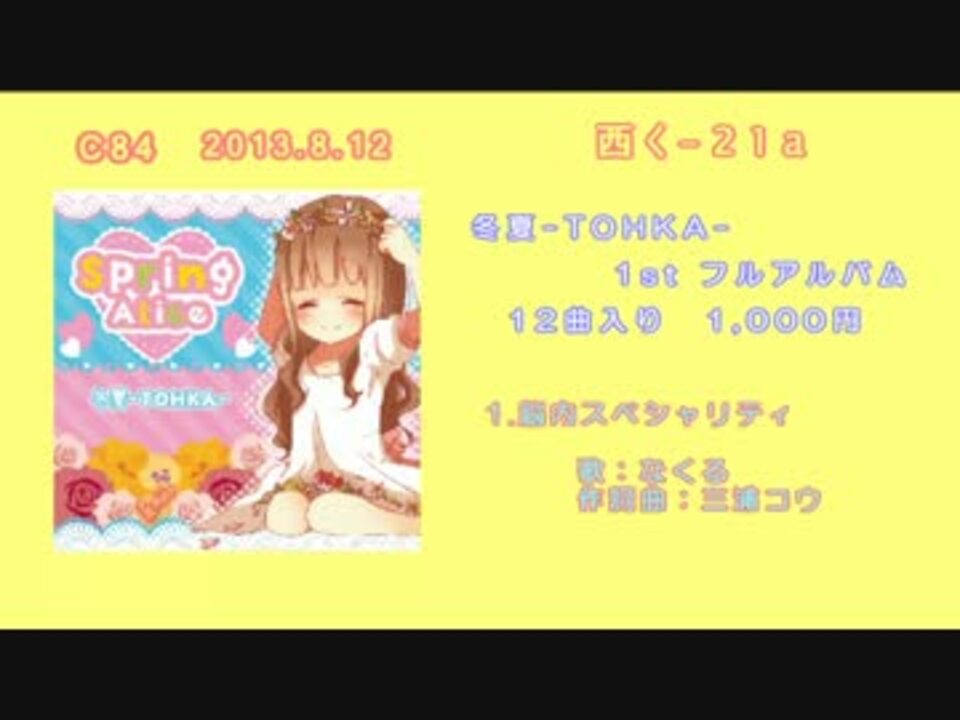 <font color="ff8135"><b>●告知●</b></font><br /><br />冬夏-TOHKA- 1stフルアルバム「Spring Alice」<br />12曲入り 1,000円(イベント価格)/1,365円(ショップ価格)<br />C84三日目(8/12) 西く-21a<br /><br /><b>*特設サイト*</b> <u><a href="http://tohka.main.jp/springalice/" target="_blank" rel="noopener nofollow">http://tohka.main.jp/springalice/</a></u><br /><b>*マイリスト*</b> <a href="https://www.nicovideo.jp/mylist/30425409" target="_blank" rel="noopener">mylist/30425409</a><br /><br /><b>【冬夏-TOHKA-】</b><br />MAMIRIN/なゆの/トモパチ/なくる/ぽいこ/ゆいにゃん*<br />よーすけ@KG/三浦コウ/エンペラータイム/おにぎり姫<br /><b>【ゲスト様】</b><br />舞楼/井上みゆ/ひななた/ちな/りこ。/笑兵衛/莉月/紫咲ほたる(EastNewSound)<br />けいか/aria/わゆき/後方一気/いき/うらら<br /><br /><b>*前作*</b> C83「CHERISH」<a href="https://www.nicovideo.jp/watch/sm19674107" class="watch">sm19674107</a>