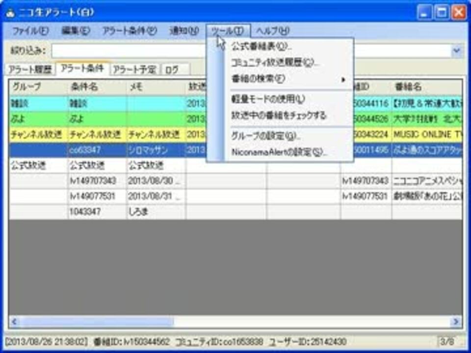 ニコニコ生放送の番組開始を通知してくれるソフトです。<br><br><span style="color: #ff0000;">2019/01/15(火)に</span><span style="color: #ff0000;"><strong>API提供を含むニコ生のアラートサービスが終了した</strong></span><span style="color: #ff0000;">ため、</span><br>APIを利用しているニコ生アラート(白)の番組開始通知も終了しました。<br>(延命処置としてAPIの代わりにRSSを利用する機能は実装してあります)<br> さようならニコ生<br><br>条件に「コミュニティID」「ユーザーID」「キーワード」などを指定できます。<br>通知は「ポップアップ」「サウンド再生」「メール送信」「ブラウザ起動」「アプリ実行」などがあります。<br><br>.NET Framework3.5が入っている環境なら動くと思います。<br>危ないと思ったら使用を止めましょう。<br>何が起きても責任は一切取れません!<br><br><strong><u>公開ページ</u></strong><br><a href="https://shiroma.space/software/niconamaalert/" target="_blank" rel="noopener nofollow">https://shiroma.space/software/niconamaalert/</a><br><strong><u>パスワード</u></strong><br>[しろまユーザーID]-[シロマッサンコミュニティ番号]=[zipファイルのパスワード]<br><br>作ったものマイリスト:<a href="https://www.nicovideo.jp/mylist/45765085" target="_blank" rel="noopener">mylist/45765085</a><br>