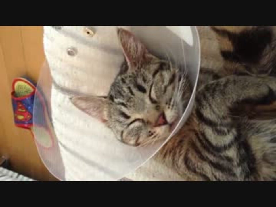 初投稿です。我が家の猫は普段は可愛いのに寝顔が…※首はしまってません! ※避妊手術したばかりなのでエリザベスカラーつけてます。