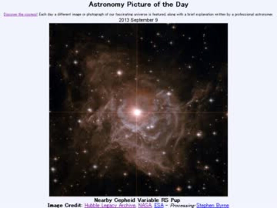 <b>2013年 9月9日 Astronomy Picture of the Day<br />Nearby Cepheid Variable RS Pup 「近くのケフェイド変光星 とも座RS星」</b><br /><br />APODとはNASAの天文学者が、毎日天文に関する画像に説明を添えて公開しているサイトです。<br />英語の勉強に読んでます。間違いがあれば指摘頂けると嬉しいです。<br /><br /><b>美しい写真と原文</b><br /><a href="http://apod.nasa.gov/apod/ap130909.html" target="_blank" rel="noopener nofollow">http://apod.nasa.gov/apod/ap130909.html</a><br /><b>お借りした素材</b><br />Wikipediaより<br />"Light curve of Betelgeuse" by AAVSO<br />ESOより<br />"eso0805c","eso0805b"<br /><b>お借りした音源</b><br /><a href="https://commons.nicovideo.jp/works/nc71689" target="_blank" rel="noopener">nc71689</a>「bury」 by まさか<br /><br />APODreadingマイリスト <a href="https://www.nicovideo.jp/mylist/32170692" target="_blank" rel="noopener">mylist/32170692</a> (<a href="https://www.nicovideo.jp/watch/sm21795672" class="watch">sm21795672</a><前日 翌日><a href="https://www.nicovideo.jp/watch/sm21809483" class="watch">sm21809483</a>)<br /><br />ちょいとトライしてみたんですが、時間泥棒なのでこれからも続くかはちょっと解りません。