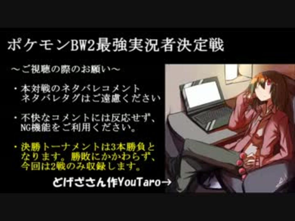 <font size="+2" color="red">ラスボス</font><br /><br />決勝1本目は、2戦を収録します<br />片方が2勝したら終わり、1勝1敗なら後日投稿されます。<br /><br />選出カットがありますが、実際に収録した音声を抜粋して利用しています。<br />2窓の方はご注意ください。<br /><br />1戦目選出決定<a href="#" class="seekTime" data-seekTime="5:58" onclick="seekNicoPlayer('#5:58'); return false;">#5:58</a> 2戦目選出決定<a href="#" class="seekTime" data-seekTime="27:49" onclick="seekNicoPlayer('#27:49'); return false;">#27:49</a><br />@しいなさん視点→<a href="https://www.nicovideo.jp/watch/sm21854599" class="watch">sm21854599</a><br /><br />【前】決勝トナメ準決勝 <a href="https://www.nicovideo.jp/watch/sm21724230" class="watch">sm21724230</a> 【次】<br /><br />大会マイリスト→<a href="https://www.nicovideo.jp/mylist/36983130" target="_blank" rel="noopener">mylist/36983130</a><br />絵の提供:どげざさん→co1380840<br /><br />使用BGM<br />あとで更新