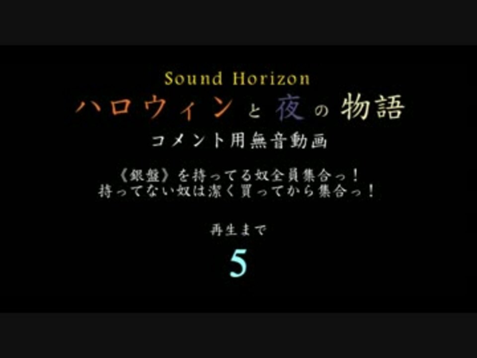 此の動画はSound Horizon Maxi Single「<font color="#cc6600">ハロウィン</font>と<font color="#160066">夜</font>の物語」を購入した人が語り合うための動画です。カウントダウンに合わせて《銀盤》を再生させて下さい。<br />(ギャップレス再生でない場合、ズレが生じる可能性が在ります)<br /><br />1. <a href="#" class="seekTime" data-seekTime="0:05" onclick="seekNicoPlayer('#0:05'); return false;">#0:05</a> / 2. <a href="#" class="seekTime" data-seekTime="10:38" onclick="seekNicoPlayer('#10:38'); return false;">#10:38</a> / 3. <a href="#" class="seekTime" data-seekTime="13:56" onclick="seekNicoPlayer('#13:56'); return false;">#13:56</a> <font color="#eeeeee">/ 4. 22:06</font><br /><br />◆自作SH/LH無音動画 → <a href="https://www.nicovideo.jp/mylist/59044428" target="_blank" rel="noopener">mylist/59044428</a>