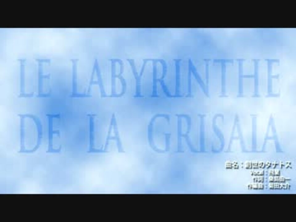 ゲーム名:グリザイアの迷宮 -LE LABYRINTHE DE LA GRISAIA- (FrontWing) 好評発売中 <br />曲:創世のタナトス <br />Vo:飛蘭 <br /><br />単一曲投稿 <a href="https://www.nicovideo.jp/mylist/33296995" target="_blank" rel="noopener">mylist/33296995</a> <br />飛蘭さんのアルバム『PRISM』に収録されているPCゲーム『グリザイアの迷宮』のグランドOP曲です。<br />TVアニメ『グリザイアの果実』の13話EDでも流れました。<br />飛蘭さんの力強い歌声を、存分に聴いてください。 <br /><br />※映像は脳内に直接流れる!かもしれない、次世代のハイスペックな動画仕様になっています。 <br /> 心の目で観てください。 <br /><br />※歌詞ありがとうございます。<br /><br />フレーム:640x360, Sorenson Spark(FLV1 25fps):143kbps, MP3:320kbps <br />