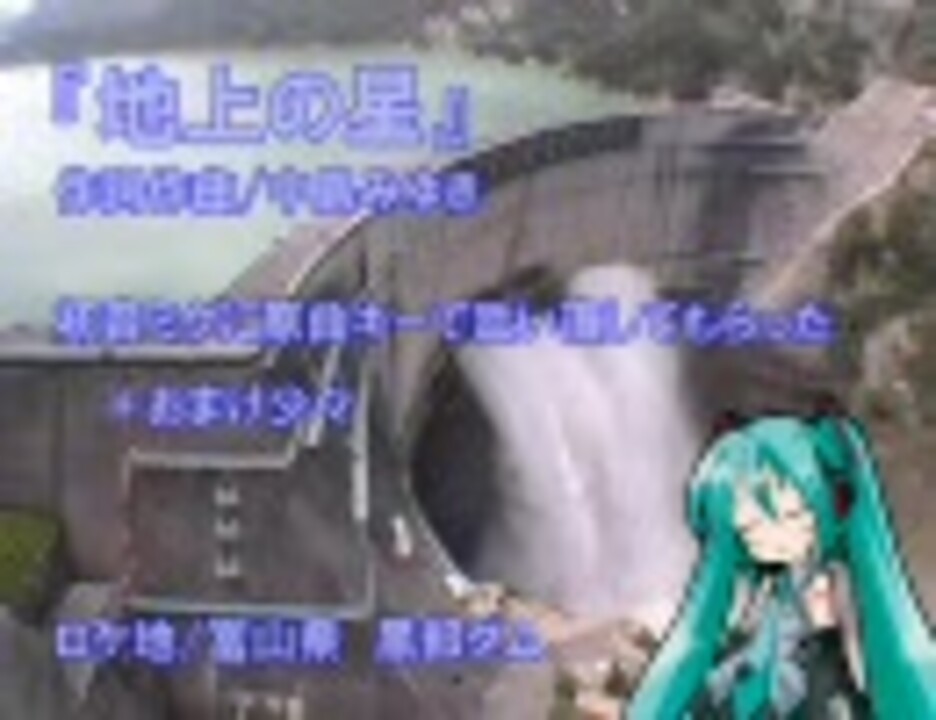 2008/3/31新作(【黒部ダム】鏡音リンが『地上の星』を元気に歌ってくれた【ダム放流】<a href="https://www.nicovideo.jp/watch/sm2842193" class="watch">sm2842193</a>)この動画は伴奏とミクの同期ズレがあります。修正版はこちら→<a href="https://www.nicovideo.jp/watch/sm2222096" class="watch">sm2222096</a>他の作品→<a href="https://www.nicovideo.jp/mylist/4653434" target="_blank" rel="noopener">mylist/4653434</a>直近20件の新作→<a href="https://www.nicovideo.jp/mylist/6720332" target="_blank" rel="noopener">mylist/6720332</a>動画には口パク用ソフトとして Lipsync(<a href="http://www32.atwiki.jp/lipsync/)" target="_blank" rel="noopener nofollow">http://www32.atwiki.jp/lipsync/)</a> と さなり氏のキャラ素材を使わせていただいております