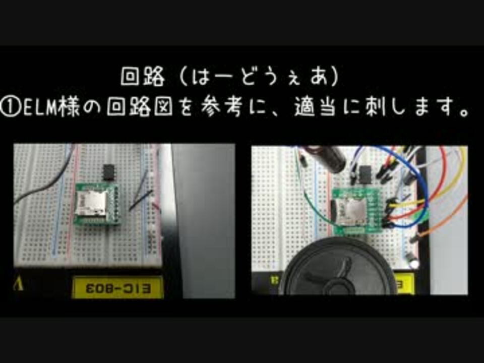 動画作るの初めてなのでちょっと早くなりすぎた。<br />今にして思えば、ちょっと意味不明になってると思う。きっとそんな日もある。<br /><br /><br />パクリ元:<br /> [1]<a href="https://www.nicovideo.jp/watch/sm22368657" class="watch">sm22368657</a>, Hayato0o さん, 冷蔵庫に住んで話しかけてくる初音ミクを作ってみた, Dec. 1 (2013)<br /><br />参考元:<br />[2]<a href="https://www.nicovideo.jp/watch/sm7607242" class="watch">sm7607242</a>, NE555 さん,8ピンICで遊ぶ【電子工作】, 12 July (2009) URL: <a href="http://elm-chan.org/works/sd8p/report_j.html" target="_blank" rel="noopener nofollow">http://elm-chan.org/works/sd8p/report_j.html</a><br />BGM, SE;<br /><br />ピンポンパンポン:<a href="https://commons.nicovideo.jp/works/nc75444" target="_blank" rel="noopener">nc75444</a>,アイビー さん<br />人生オワタ:<a href="https://www.nicovideo.jp/watch/sm3252511" class="watch">sm3252511</a>, ______ さん<br />てってってー:<a href="https://www.nicovideo.jp/watch/sm3505467" class="watch">sm3505467</a>, まゆげ さん<br />にっこにっこにーwww:<a href="https://www.nicovideo.jp/watch/sm20071125" class="watch">sm20071125</a>, 未知 さん<br />