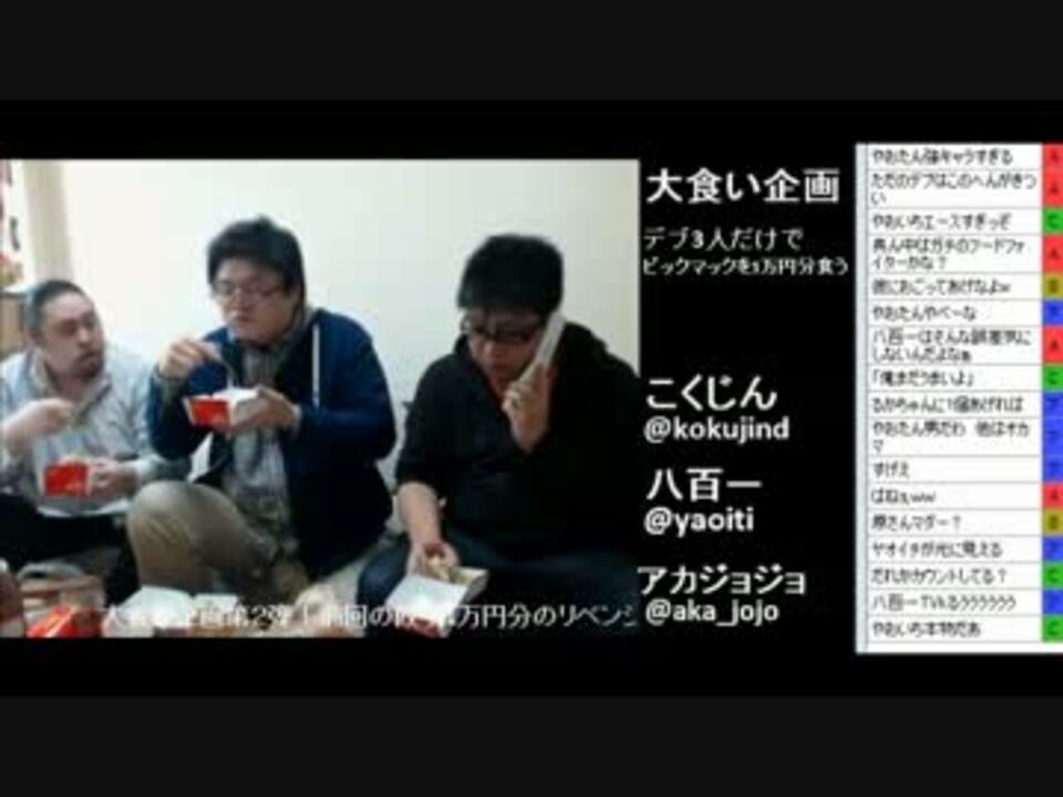 こくじんTV(co1410443)における大食い企画です(<a href="https://live.nicovideo.jp/watch/lv166516597" target="_blank" rel="noopener">lv166516597</a>)<br />【大食い企画】デブ3人でビッグマックだけで1万円分食えるか放送<br />・デブ3(八百一、アカジョジョ、こくじん)のみ<br />・ビックマックだけで一万円(ジュースやポテトなどは別財布)<br />・ビックマック詳細<br /><a href="http://www.mcdonalds.co.jp/quality/basic_information/menu_info.php?mid=1210" target="_blank" rel="noopener nofollow">http://www.mcdonalds.co.jp/quality/basic_information/menu_info.php?mid=1210</a><br />食べれなかった分のビックマックは必ずスタッフがすべていただきます。<br /><br />1/3→<a href="https://www.nicovideo.jp/watch/sm22719355" class="watch">sm22719355</a> 2/3→いまここ 3/3→<a href="https://www.nicovideo.jp/watch/sm22719951" class="watch">sm22719951</a><br />他の→<a href="https://www.nicovideo.jp/mylist/39494414" target="_blank" rel="noopener">mylist/39494414</a>