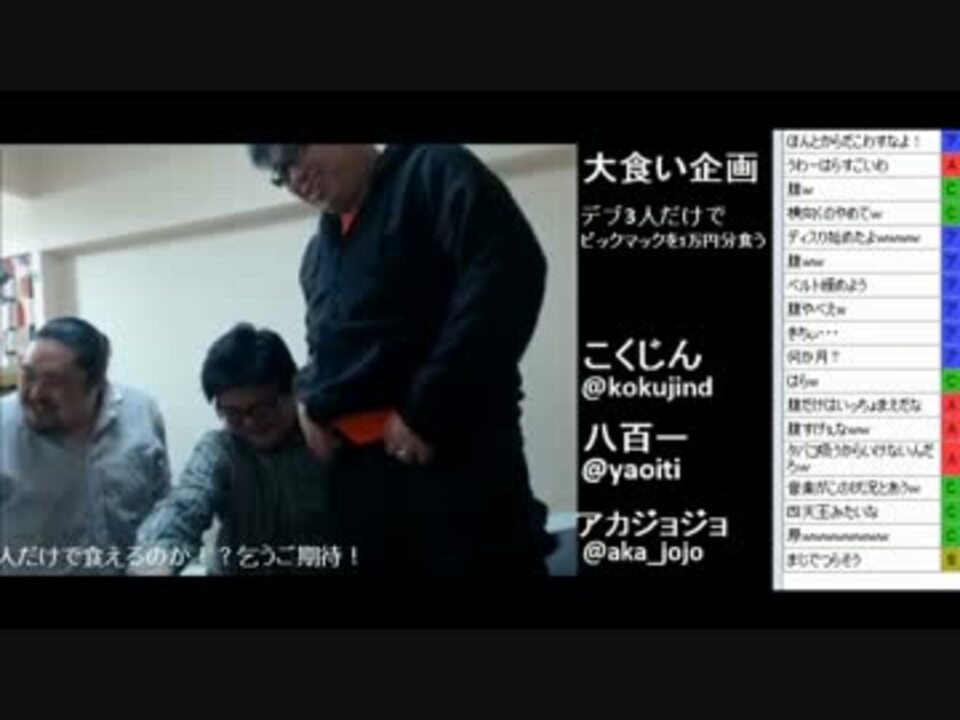 こくじんTV(co1410443)における大食い企画です(<a href="https://live.nicovideo.jp/watch/lv166516597" target="_blank" rel="noopener">lv166516597</a>)<br />【大食い企画】デブ3人でビッグマックだけで1万円分食えるか放送<br />・デブ3(八百一、アカジョジョ、こくじん)のみ<br />・ビックマックだけで一万円(ジュースやポテトなどは別財布)<br />・ビックマック詳細<br /><a href="http://www.mcdonalds.co.jp/quality/basic_information/menu_info.php?mid=1210" target="_blank" rel="noopener nofollow">http://www.mcdonalds.co.jp/quality/basic_information/menu_info.php?mid=1210</a><br />食べれなかった分のビックマックは必ずスタッフがすべていただきます。<br /><br />放送とコメで謎のズレが発生したためTSで直してます<br />part2から直したかったのですが不自然になるためこっから修正<br /><br />1/3→<a href="https://www.nicovideo.jp/watch/sm22719355" class="watch">sm22719355</a> 2/3→<a href="https://www.nicovideo.jp/watch/sm22719895" class="watch">sm22719895</a> 3/3→いまここ<br />他の→<a href="https://www.nicovideo.jp/mylist/39494414" target="_blank" rel="noopener">mylist/39494414</a>