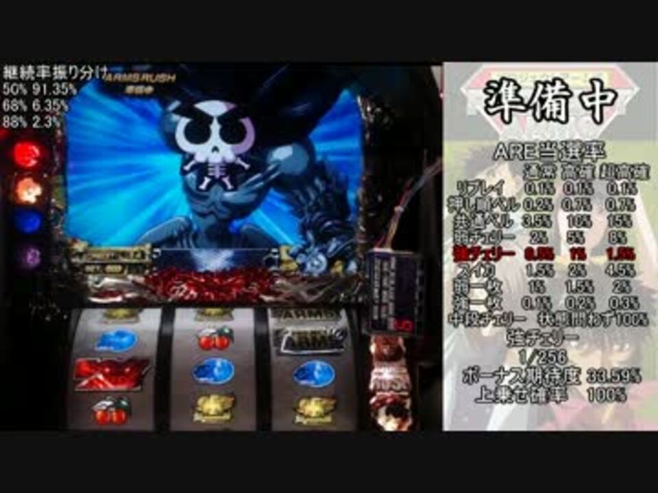 多分これが一番うるさいと思います<br /><br />目標:フリーズ(通常時・BIG中・REG中)<br /> ED<br /> 青カットインでARMS図柄を揃える<br /> 咆哮アタック<br /> 3桁上乗せ<br /><br />PROJECT ARMSマイリスト <a href="https://www.nicovideo.jp/mylist/39753030" target="_blank" rel="noopener">mylist/39753030</a><br />鮪伝説マイリスト <a href="https://www.nicovideo.jp/mylist/38705128" target="_blank" rel="noopener">mylist/38705128</a><br />政宗マイリスト <a href="https://www.nicovideo.jp/mylist/37088886" target="_blank" rel="noopener">mylist/37088886</a><br />コミュニティ co1988375<br /><br />青7BIG Go Heaven! <a href="https://www.nicovideo.jp/watch/sm22527854" class="watch">sm22527854</a><br />赤7BIG Get ARMS! <a href="https://www.nicovideo.jp/watch/sm22528054" class="watch">sm22528054</a><br /><a href="https://www.nicovideo.jp/watch/sm22869793" class="watch">sm22869793</a>←前回 次回→<a href="https://www.nicovideo.jp/watch/sm23233179" class="watch">sm23233179</a> <br /><br /><br />