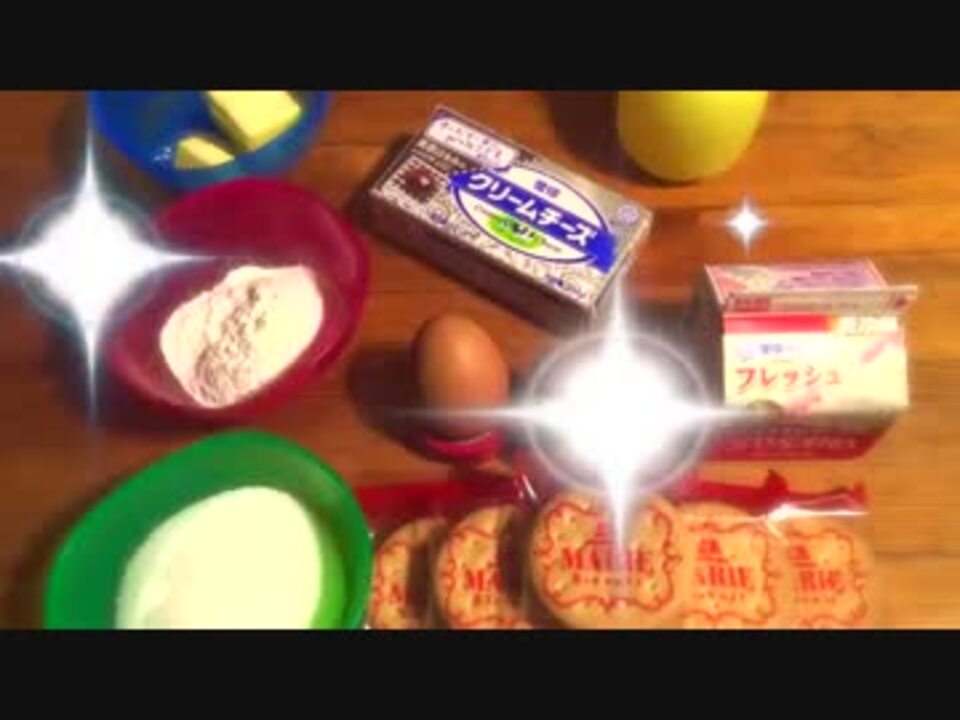 こんにちは。cororeです。<br />チーズケーキってたまに無性に食べたくなっちゃいますよね。<br />というわけで、どこか懐かしい感じもする<br />ベイクドチーズケーキを作ってみました。<br />焼きたてと冷やした後では違う食感が楽しめますよ。<br />カロリーなんて忘れて好きなだけ食べましょうっ(いけません)<br /><br />材料<br /><br />クリームチーズ 200g<br />グラニュー糖 90g<br />卵 2個<br />生クリーム 200ml<br />薄力粉 30g<br />レモン汁 大さじ1<br />ビスケット 100g<br />無塩バター 40g<br /><br /><br />Music by : Ménage Quad (Good Thing)<br />Silent Partner (Camagüey)<br /><br />前回 (電子レンジで作るスポンジケーキ)→<a href="https://www.nicovideo.jp/watch/sm23230583" class="watch">sm23230583</a> <br />次回 (ショートブレッド)→<a href="https://www.nicovideo.jp/watch/sm23481858" class="watch">sm23481858</a><br />今までに作ったお菓子→<a href="https://www.nicovideo.jp/mylist/42293434" target="_blank" rel="noopener">mylist/42293434</a>