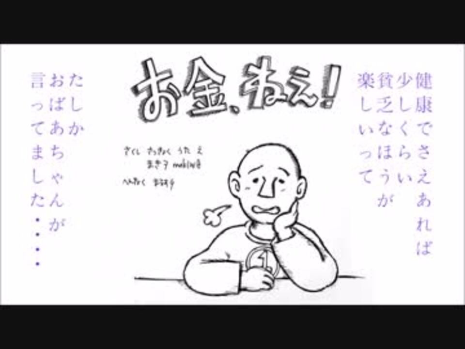 絵、作詞、作曲、うた=まきヲ本人。<br /><br />お金ねぇとオッカネェあれこれ、<br />がんばらなきゃいけないあれこれ、<br />ほっこりヒキコ悲喜こもごもな<br />昭和チック貧乏ソング。<br />3分の作品です。<br /><br />いろんな意味で初心者です・・・<br /><br />くわしい解説?はこちらに。<br /><a href="http://makiwo.blog.so-net.ne.jp/aboutokanenee" target="_blank" rel="noopener nofollow">http://makiwo.blog.so-net.ne.jp/aboutokanenee</a><br /><br />お金なくても、いろいろ工夫して、あっけらかんといきましょう♪<br /><br />