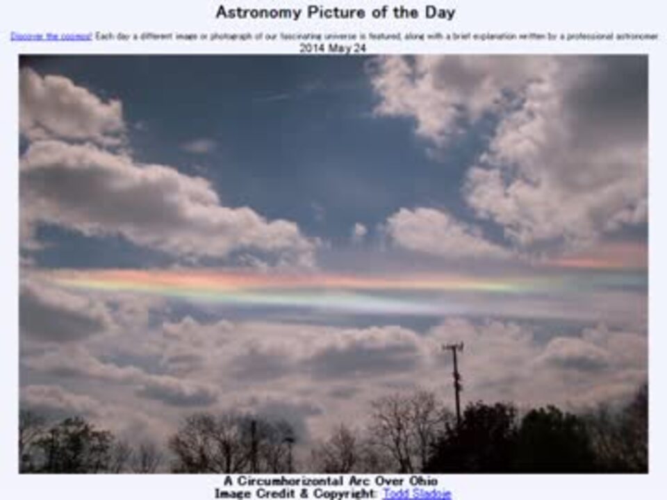 <b>2014年 5月24日 Astronomy Picture of the Day<br />A Circumhorizontal Arc Over Ohio 「オハイオ上空に現れた環水平アーク」</b><br /><br />APODとはNASAの天文学者が、毎日天文に関する画像に説明を添えて公開しているサイトです。<br /><br /><b>美しい写真と原文</b><br /><a href="http://apod.nasa.gov/apod/ap140524.html" target="_blank" rel="noopener nofollow">http://apod.nasa.gov/apod/ap140524.html</a><br /><b>お借りした素材</b><br />Wikipediaより<br />"Highly iridising altocumulus" by C messier<br />"SunArcs2011Oregon" by Fancy-cats-are-happy-cats<br />"Ohio in United States" by TUBS<br />"Dispersive Prism Illustration by Spigget" by Spigget<br />ニコニコモンズより<br />"虹?" by まーくん<br /><b>お借りした音源</b><br /><a href="https://commons.nicovideo.jp/works/nc80761" target="_blank" rel="noopener">nc80761</a>「脱力系3」 by もっぴーさうんど<br /><br />APODreadingマイリスト <a href="https://www.nicovideo.jp/mylist/32170692" target="_blank" rel="noopener">mylist/32170692</a> (<a href="https://www.nicovideo.jp/watch/sm23653146" class="watch">sm23653146</a><前日 翌日>)<br /><br />転載はご遠慮下さい。<br />日の高い今頃が見ごろとのことです