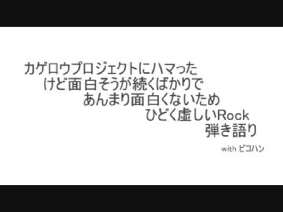 アニメ版OPである『daze』のMVとフル(<a href="https://www.nicovideo.jp/watch/sm23662565" class="watch">sm23662565</a>)がとてもカッコよくてとても面白そうで「おおおおお」ってなったあと当のアニメである『メカクシティアクターズ』を思い返してみたら面白くなくてすごく虚しくなったのでついカっとなって弾き語りしました。<br /><br />タイトル(正式名称)は<font size="5">『カゲロウプロジェクトにハマったけどひどく虚しいRock withピコハン』</font>です。動画内のタイトルはロングバージョン。<br /><br /><b>※歌詞の一部にメカクシティアクターズ2話から台詞を引用。</b><br /><br />最近カゲプロしてるマイリス<a href="https://www.nicovideo.jp/mylist/43455732" target="_blank" rel="noopener">mylist/43455732</a> 普段のマイリス<a href="https://www.nicovideo.jp/mylist/3346139" target="_blank" rel="noopener">mylist/3346139</a><br /><br />あ、不自然の味方Pはセルフプロデュースです。<br />追:歌詞載せました<a href="https://ch.nicovideo.jp/article/ar544934" target="_blank" rel="noopener">ar544934</a> /一人で頑張って『?』とか連打してた子のコメは流石にNGしたよごめんね。