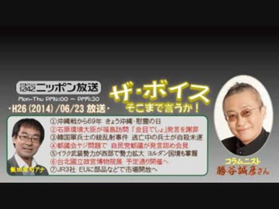 今回は大丈夫です! ~はさておきw<br />『ザ・フォーカス』での【富岡製糸場】に対する提言も良かったですが、今回の真骨頂は、2本目『石原環境相の失言』に絡み、読売新聞が「9月にも内閣改造か」と報道したことを「無いと思う。だって……」と、勝谷さんならではの視点で解説されたところですね。その正否はともかくw、思わず「へぇ」と感心した内容は、ぜひ実際にお聴きください!<br /><br />ところで、都議会ヤジの件に際し、「塩村議員もアレな奴だから別にいいだろ」的な擁護(?)を目にしますが、例え相手が悪人でも「それを言っちゃあお終いよ」になるのが民の1票から成る議員。此度の件を"危機管理"の一環だと見れば、そんな的外れな擁護は要りませんw<br />※街ステ飛ばし→ <a href="#" class="seekTime" data-seekTime="36:57" onclick="seekNicoPlayer('#36:57'); return false;">#36:57</a><br />□<a href="https://www.nicovideo.jp/mylist/36340069" target="_blank" rel="noopener">mylist/36340069</a>□<a href="https://www.nicovideo.jp/mylist/41644857" target="_blank" rel="noopener">mylist/41644857</a>