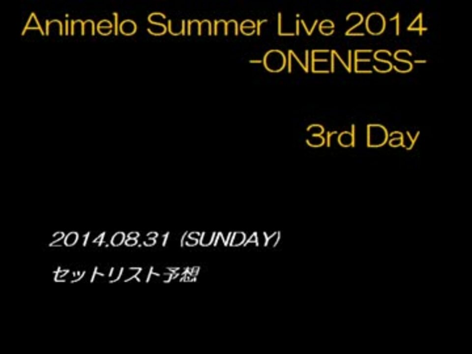 Animelo Summer Live 2014 -ONENESS-に向けてのセットリスト予想になります。アーティストや楽曲の予想や、皆さんの予想を語る場としてどうぞ。<br />こちらは8月31日(日)分の中編となります。<br />注意事項等は昨年までの動画を参照。<br /><br /><br /><br />29日・前編⇒<a href="https://www.nicovideo.jp/watch/sm24212264" class="watch">sm24212264</a> / 中編⇒<a href="https://www.nicovideo.jp/watch/sm24238019" class="watch">sm24238019</a> / 後編⇒<a href="https://www.nicovideo.jp/watch/sm24216823" class="watch">sm24216823</a><br />30日・前編⇒<a href="https://www.nicovideo.jp/watch/sm24223116" class="watch">sm24223116</a> / 中編⇒<a href="https://www.nicovideo.jp/watch/sm24283650" class="watch">sm24283650</a> / 後編⇒<a href="https://www.nicovideo.jp/watch/sm24239991" class="watch">sm24239991</a><br />31日・前編⇒<a href="https://www.nicovideo.jp/watch/sm24248351" class="watch">sm24248351</a> / 中編⇒<a href="https://www.nicovideo.jp/watch/sm24252990" class="watch">sm24252990</a> / 後編⇒[イマココ]<br />増刊号⇒<a href="https://www.nicovideo.jp/watch/sm24322225" class="watch">sm24322225</a><br /><br /> 【過去の予想】 ⇒ <a href="https://www.nicovideo.jp/mylist/26536810" target="_blank" rel="noopener">mylist/26536810</a>