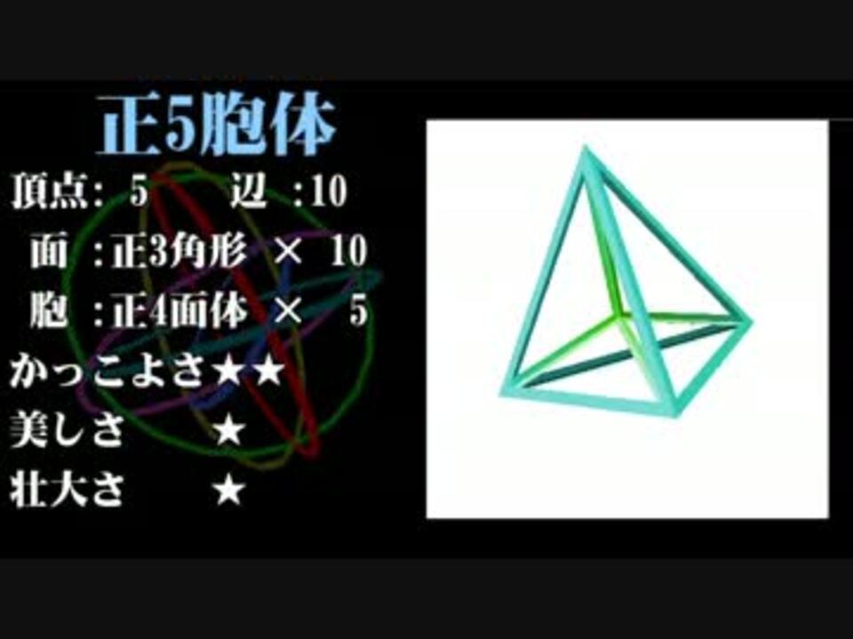 立体視(平行法)で4次元図形を見よう。<br />難しい知識がなくても「なんかスゲー」程度に楽しめます。<br />※4次元に関する基礎知識はこちら→<a href="https://www.nicovideo.jp/watch/sm24551162" class="watch">sm24551162</a><br /><br /><font color="red">問題作の再アップ版。旧・03Aを地声に変えただけです。</font><br />※「正4面体」の読みは一般には「せいしめんたい」のようですが、「せいよんめんたい」でも間違いではないようです。<br /><br />作者サイト:<a href="http://www.myu.ina-ka.com/" target="_blank" rel="noopener nofollow">http://www.myu.ina-ka.com/</a> <br />4次元研究ページ:<a href="http://www.myu.ina-ka.com/patternF/" target="_blank" rel="noopener nofollow">http://www.myu.ina-ka.com/patternF/</a> <br /><br />PREV:<a href="https://www.nicovideo.jp/watch/sm24555910" class="watch">sm24555910</a>(四角いなさすが超立方体しかくい) <br />NEXT:<a href="https://www.nicovideo.jp/watch/sm24586076" class="watch">sm24586076</a>(お前の双対だろ、なんとかしろよ)<br />シリーズ:<a href="https://www.nicovideo.jp/mylist/45778415" target="_blank" rel="noopener">mylist/45778415</a><br />