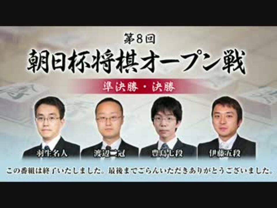 2015年2月14日開催<br />第8回朝日杯将棋オープン戦【決勝戦】の編集勝手版。※勝敗のネタバレが含まれますので閲覧要注意のこと<br /><br />詳しい棋譜と指し手解説は、朝日杯将棋オープン戦中継サイト(<a href="http://live.shogi.or.jp/asahi/)をご覧ください" target="_blank" rel="noopener nofollow">http://live.shogi.or.jp/asahi/)をご覧ください</a>。<br /><br />【対局者】(先手)羽生善治 名人 vs 渡辺明 二冠(後手)<br /><br />持ち時間:各40分<br /><br />【解説・聞き手】山崎隆之 八段 山口恵梨子 女流初段