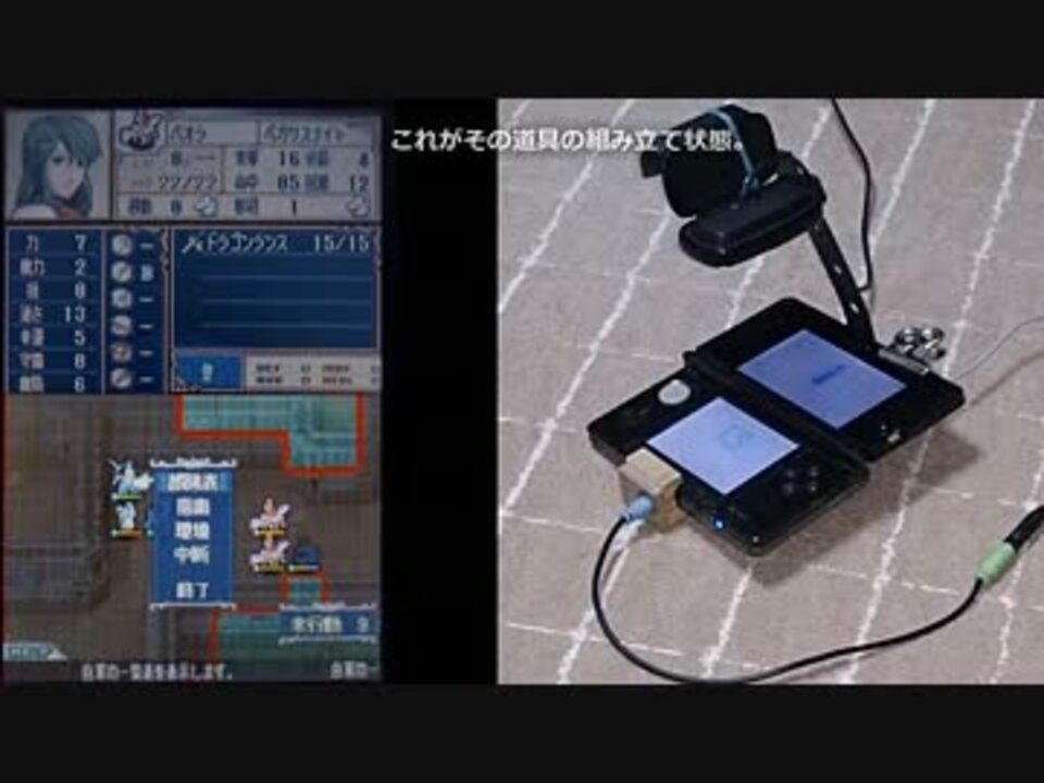 無印 3DSとWebカメラを使ったDS直撮り&編集のコツを説明します。<br />・フォーカス、色設定の例<br />・AviUtlの拡張編集を使った上下画面分離、簡易変形による台形補正<br />・数時間の撮影に耐える安定した撮影装置<br />補足:<br />・投稿用にエンコードするとモアレが薄まりました。<br />・なぜかC615でフレームレートは15までしか出ませんでした。<br /><font color=red>・木工不要の改良版撮影装置:</font> <a href="http://www2.axfc.net/uploader/so/3503723" target="_blank" rel="noopener nofollow">http://www2.axfc.net/uploader/so/3503723</a> (動画撮影のシート)<br />・tomo兄貴: <a href="https://ch.nicovideo.jp/article/ar932028" target="_blank" rel="noopener">ar932028</a><br /><br />サンプル動画は ファイアーエムブレム 新・暗黒竜と光の剣, 新・紋章の謎, ADVANCE WARS DAYS OF RUIN (ファミコンウォーズDS2) を使用しています。<br />メインの新暗黒竜はコネタもあります。パオラェ……<br /><br />本編: <a href="https://www.nicovideo.jp/mylist/49181254" target="_blank" rel="noopener">mylist/49181254</a> 特に関係ない投稿動画: <a href="https://www.nicovideo.jp/mylist/8958507" target="_blank" rel="noopener">mylist/8958507</a>