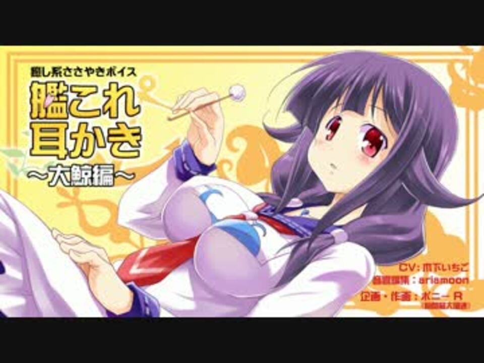 初めての耳かきボイス作製、そして動画投稿になります!<br />今回は癒し系キャラの大鯨ちゃんで作ってみました。<br />これを聴きながら癒され眠くなって頂けると幸いです。<br />もちろんヘッドフォン推奨です!<br /><br />サークル瞬間最大風速、初の耳かきボイス作品になります!<br />CVに犬塚いちご(旧:木下いちご)様、<br />音響編集にご自身でも艦これ耳かき動画を作製されている<br />ariamoom様にお越し頂きました。感謝!<br /><br />■瑞鳳編(<a href="https://www.nicovideo.jp/watch/sm25796497" class="watch">sm25796497</a>)■香取編(<a href="https://www.nicovideo.jp/watch/sm26472447" class="watch">sm26472447</a>) <br /><br />・企画 ポニーR(瞬間最大風速)Twitter(@saidaihusoku) コミュ二ティ(co1912179)<br />・CV 犬塚いちご Twitter(@_kumaichigo_) マイリスト(<a href="https://www.nicovideo.jp/mylist/29521344" target="_blank" rel="noopener">mylist/29521344</a>)<br />・音響編集 ariamoon 艦これ耳かきマイリスト(<a href="https://www.nicovideo.jp/mylist/43818041" target="_blank" rel="noopener">mylist/43818041</a>)<br />