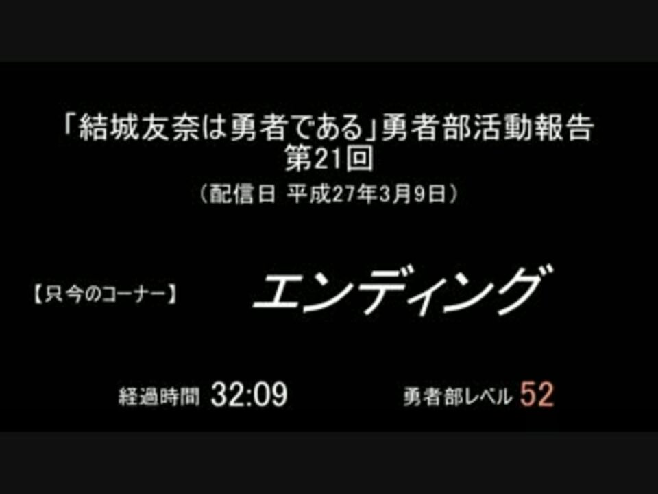 「結城友奈は勇者である」勇者部活動報告 第21回(平成27年3月9日 配信)<br />パーソナリティ:照井春佳(結城友奈 役)、内山夕実(犬吠埼風 役)、黒沢ともよ(犬吠埼樹 役)<br />【ご案内】<br />この動画はSZBH方式です。音声はありません。以下のラジオ配信ページからの音声と動画を同時に再生してコメントをお楽しみください。<br />ラジオ配信ページ:<a href="http://www.onsenradio.info/index.html?pid=yuyuyu" target="_blank" rel="noopener nofollow">http://www.onsenradio.info/index.html?pid=yuyuyu</a><br />前→<a href="https://www.nicovideo.jp/watch/sm25676684" class="watch">sm25676684</a>(他の方が上げてくださったニコ生の動画です)<br />次→<a href="https://www.nicovideo.jp/watch/sm25801720" class="watch">sm25801720</a><br />ラジオCD録り下ろし→<a href="https://www.nicovideo.jp/watch/sm25788708" class="watch">sm25788708</a><br />《お詫び》レベル表示に不備がありました。申し訳ございません。