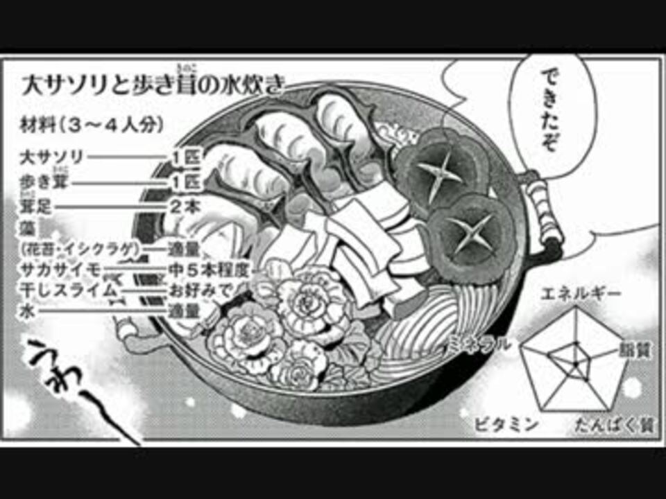 トイキさん[<a href="https://www.nicovideo.jp/user/10746634" target="_blank" rel="noopener">user/10746634</a>]主催の再現料理祭に参加させていただきました。<br /><br />こんにちは リクツモノ です。<br />こんかい は さいげんりょうり と いうことで、<br />ダンジョンめし の <br />『大サソリ と 歩き茸 の 水炊き』 を <br />つくりたい と おもいます。<br />
