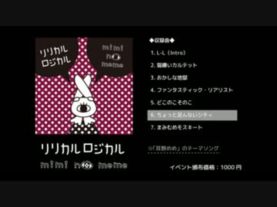 <b>耳野めめ『リリカルロジカル』</b><br /><br />ちょっと足んない系うさぎアイドル耳野めめの架空のデビューアルバムです。<br />謎の切なさをあなたに。<br /><font color="gray">※CDはM3でほんとに頒布します!(物理)</font><br /><br /><font color="purple">◇音楽・デザイン knee <a href="https://www.nicovideo.jp/mylist/14179657" target="_blank" rel="noopener">mylist/14179657</a> <a href="http://twitter.com/knee_" target="_blank" rel="noopener nofollow">http://twitter.com/knee_</a></font><br /><br />■7トラック/イベント価格1000円<br />■M3春 2015/04/26(日)<font color="purple">第二展示場1F え-34b「ドーハの悲劇」</font><br /><font color="gray">※スP <a href="https://www.nicovideo.jp/user/1823908" target="_blank" rel="noopener">user/1823908</a> のスペースに置かせて頂きます。<b>スPの新譜『Pop Fly』のデモはこちら!</b> <a href="https://www.nicovideo.jp/watch/sm26062115" class="watch">sm26062115</a></font><br /><br /><b>2015/05/29追記:TOKYO FUTURE MUSIC、とらのあなで委託販売してます。通販でも買えるのでよろしくね。<br />くわしくはこちら <a href="http://miminomeme.hatenablog.jp/entry/2015/04/29/200728" target="_blank" rel="noopener nofollow">http://miminomeme.hatenablog.jp/entry/2015/04/29/200728</a></b>