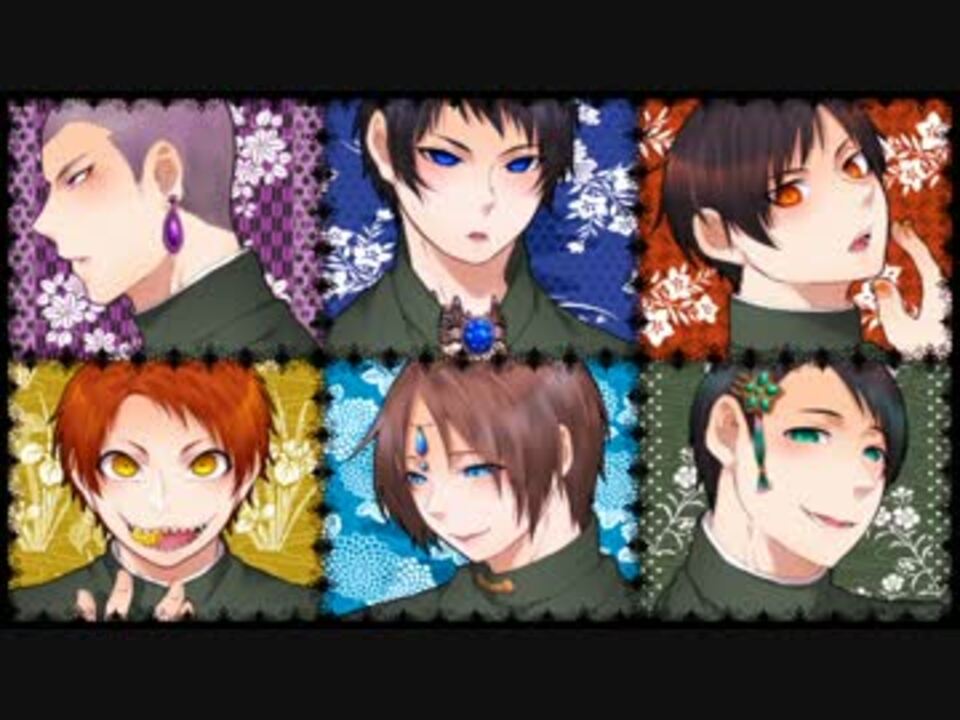 歌ったというか歌わせたというか・・・。<br />口パクなしの静止画を合てはめただけの完全な自己満足動画です。<br />誰がどの歌い手さんの声なのかは、音源をお借りした動画をご参照ください。<br />また、自分絵なのと脱帽しておりますので苦手な方は注意してください。<br /><br />それぞれにイメージカラーの宝石またはそのアクセサリーを身につけてもらいました(田噛はペディキュア)が画力不足でうまく表現できていません(特に木舌)。<br />いっそのこと目に宝石でも詰めればよかったかもしれませんね。<br /><br />背景はお借りしたものです。<br /><br /><br />【追記】それぞれの色の歌詞がある!!<br /> 歌詞職人様ありがとうございます////////<br /><br />