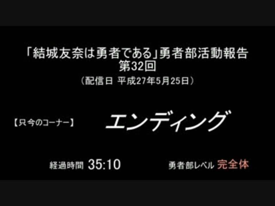 結城友奈は勇者である」勇者部活動報告 第32回(平成27年5月25日 配信)<br />パーソナリティ:照井春佳(結城友奈 役)、内山夕実(犬吠埼風 役)、黒沢ともよ(犬吠埼樹 役)<br />【ご案内】<br />この動画はSZBH方式です。音声はありません。以下のラジオ配信ページからの音声と動画を同時に再生してコメントをお楽しみください。<br />ラジオ配信ページ:<a href="http://www.onsenradio.info/index.html?pid=yuyuyu" target="_blank" rel="noopener nofollow">http://www.onsenradio.info/index.html?pid=yuyuyu</a><br />前→<a href="https://www.nicovideo.jp/watch/sm26287587" class="watch">sm26287587</a><br /><br />ラジオCD Vol.1録り下ろし→<a href="https://www.nicovideo.jp/watch/sm25788708" class="watch">sm25788708</a><br />勇者部活動報告SZBH <a href="https://www.nicovideo.jp/mylist/49248543" target="_blank" rel="noopener">mylist/49248543</a>