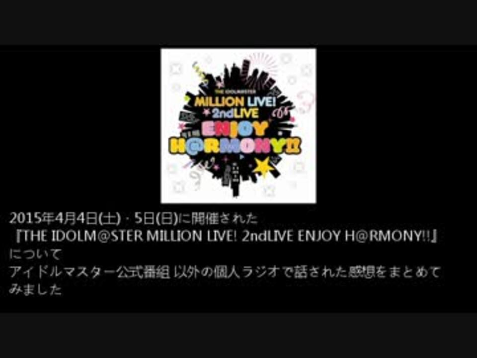 2015年4月4日・5日に開催された『THE IDOLM@STER MILLION LIVE! 2ndLIVE ENJOY H@RMONY!!』<br>についてラジオで話されたライブ感想等をまとめてみました<br>編集の都合で音声がぶつ切りになっているところも有りますがよろしくおねがいします<br><br><strong>動画中で「</strong><span style="color: #e25a9b;"><strong>舞浜歩役</strong></span><strong>」のところ誤字していたようですスミマセンm(_ _)m</strong><br>※番組情報など動画作成当時のもので現在では不正確な情報になっております。<br><br>↓ジャンプ用リンク<br><a href="#" class="seekTime" data-seekTime="00:13" onclick="seekNicoPlayer('#00:13'); return false;">#00:13</a>愛美/ <a href="#" class="seekTime" data-seekTime="10:07" onclick="seekNicoPlayer('#10:07'); return false;">#10:07</a>田所あずさ/ <a href="#" class="seekTime" data-seekTime="16:34" onclick="seekNicoPlayer('#16:34'); return false;">#16:34</a>山口立花子/ <a href="#" class="seekTime" data-seekTime="19:11" onclick="seekNicoPlayer('#19:11'); return false;">#19:11</a>渡部優衣/ <br><a href="#" class="seekTime" data-seekTime="24:18" onclick="seekNicoPlayer('#24:18'); return false;">#24:18</a>麻倉もも、雨宮天、夏川椎菜/ <a href="#" class="seekTime" data-seekTime="26:49" onclick="seekNicoPlayer('#26:49'); return false;">#26:49</a>村川梨衣/ <a href="#" class="seekTime" data-seekTime="39:52" onclick="seekNicoPlayer('#39:52'); return false;">#39:52</a>高橋未奈美/ <a href="#" class="seekTime" data-seekTime="44:31" onclick="seekNicoPlayer('#44:31'); return false;">#44:31</a>戸田めぐみ/<br><a href="#" class="seekTime" data-seekTime="47:11" onclick="seekNicoPlayer('#47:11'); return false;">#47:11</a>EXTRA.