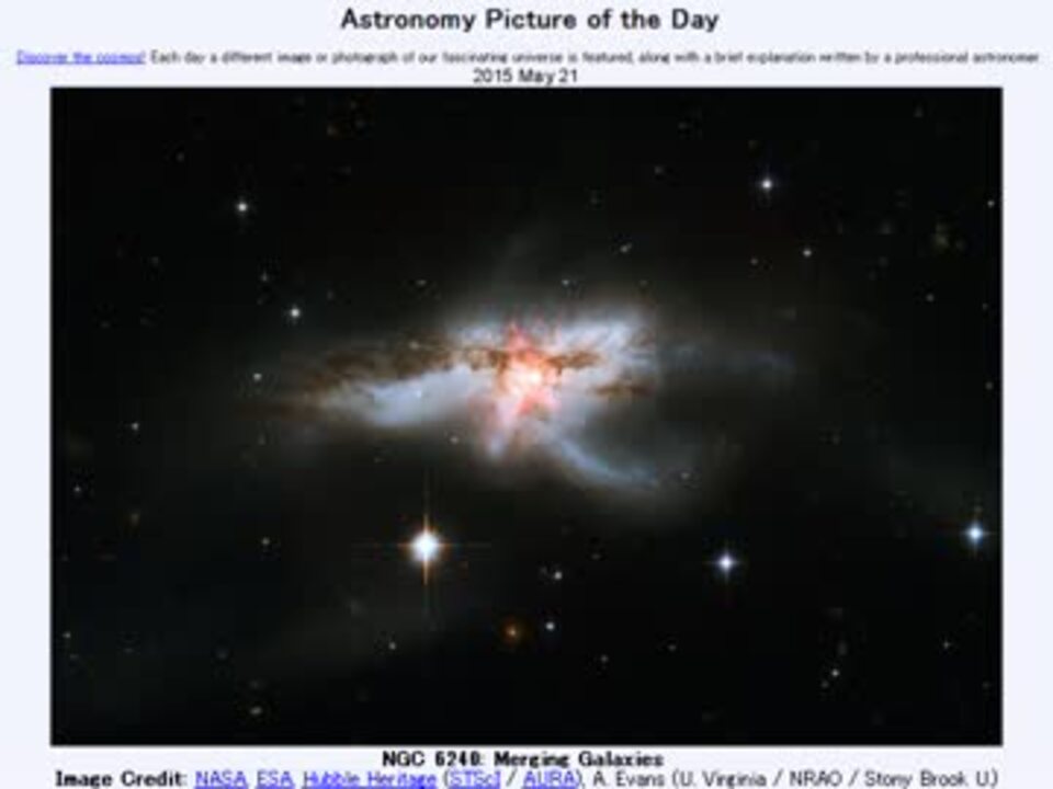 <b>2015年 5月21日 Astronomy Picture of the Day<br />NGC 6240: Merging Galaxies 「融合中の銀河:NGC 6240」</b><br /><br />APODとはNASAの天文学者が、毎日天文に関する画像に説明を添えて公開しているサイトです。<br />英語の勉強に読んでます。間違いがあれば指摘頂けると嬉しいです。<br /><br /><b>美しい写真と原文</b><br /><a href="http://apod.nasa.gov/apod/ap150521.html" target="_blank" rel="noopener nofollow">http://apod.nasa.gov/apod/ap150521.html</a><br /><b>お借りした素材</b><br />Wikipediaより<br />"Ophiuchus IAU" by IAU and Sky & Telescope magazine<br />Flickrより<br />"Ophiuchus" by chaouki<br /><b>お借りした音源</b><br /><a href="https://commons.nicovideo.jp/works/nc96301" target="_blank" rel="noopener">nc96301</a>「砂塵の城砦」 by 秋山裕和<br /><br />APODreadingマイリスト <a href="https://www.nicovideo.jp/mylist/32170692" target="_blank" rel="noopener">mylist/32170692</a> (<a href="https://www.nicovideo.jp/watch/sm26414278" class="watch">sm26414278</a><前日 翌日><a href="https://www.nicovideo.jp/watch/sm26432157" class="watch">sm26432157</a>)<br /><br />Twitter:Cc_jabberwock<br /><br />転載はご遠慮下さい。解らない事が有ったら気軽に聞いてみて下さい。調べてきます