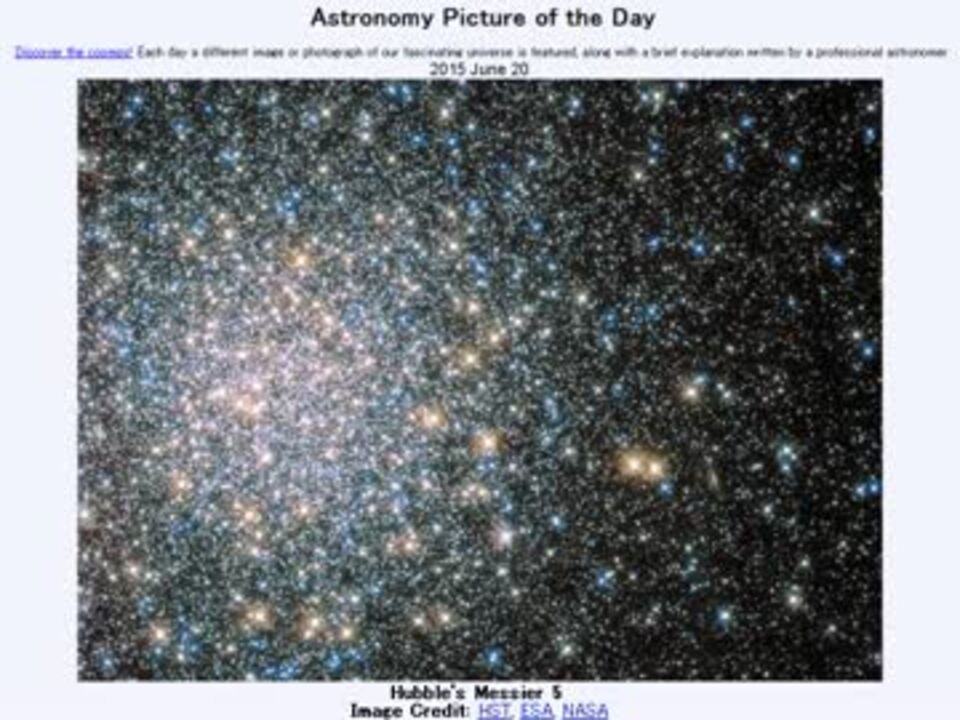 <b>2015年 6月20日 Astronomy Picture of the Day<br />Hubble's Messier 5 「ハッブルのメシエ天体5番」</b><br /><br />APODとはNASAの天文学者が、毎日天文に関する画像に説明を添えて公開しているサイトです。<br />英語の勉強に読んでます。間違いがあれば指摘頂けると嬉しいです。<br /><br /><b>美しい写真と原文</b><br /><a href="http://apod.nasa.gov/apod/ap150620.html" target="_blank" rel="noopener nofollow">http://apod.nasa.gov/apod/ap150620.html</a><br /><b>お借りした素材</b><br />Wikipediaより<br />"M5--LRGB2 898x688" by Robert J. Vanderbei<br />"Bildtafel Messierobjekte" by diverseその他多数<br /><b>お借りした音源</b><br /><a href="https://commons.nicovideo.jp/works/nc76936" target="_blank" rel="noopener">nc76936</a>「マ・タ・タ・ビ」 by delf<br /><br />APODreadingマイリスト <a href="https://www.nicovideo.jp/mylist/32170692" target="_blank" rel="noopener">mylist/32170692</a> (<a href="https://www.nicovideo.jp/watch/sm26653070" class="watch">sm26653070</a><前日 翌日><a href="https://www.nicovideo.jp/watch/sm26671090" class="watch">sm26671090</a>)<br /><br />Twitter:Cc_jabberwock <br /><br />転載はご遠慮下さい。解らない事が有ったら気軽に聞いてみて下さい。調べてきます