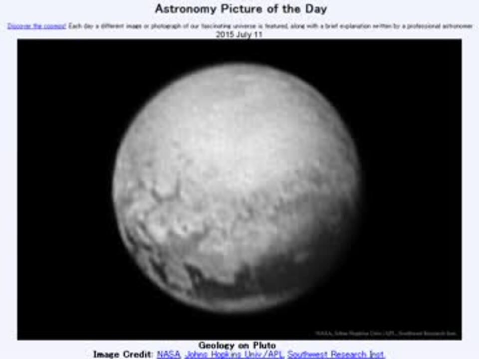 <b>2015年 7月11日 Astronomy Picture of the Day<br />Geology on Pluto 「冥王星の地質」</b><br /><br />APODとはNASAの天文学者が、毎日天文に関する画像に説明を添えて公開しているサイトです。<br />英語の勉強に読んでます。間違いがあれば指摘頂けると嬉しいです。<br /><br /><b>美しい写真と原文</b><br /><a href="http://apod.nasa.gov/apod/ap150711.html" target="_blank" rel="noopener nofollow">http://apod.nasa.gov/apod/ap150711.html</a><br /><b>お借りした音源</b><br /><a href="https://commons.nicovideo.jp/works/nc98305" target="_blank" rel="noopener">nc98305</a>「Cyber Squid」 by Cymphis<br /><br />APODreadingマイリスト <a href="https://www.nicovideo.jp/mylist/32170692" target="_blank" rel="noopener">mylist/32170692</a> (<a href="https://www.nicovideo.jp/watch/sm26873430" class="watch">sm26873430</a><前日 翌日><a href="https://www.nicovideo.jp/watch/sm26880698" class="watch">sm26880698</a>)<br /><br />Twitter:Cc_jabberwock <br /><br />転載はご遠慮下さい。解らない事が有ったら気軽に聞いてみて下さい。調べてきます