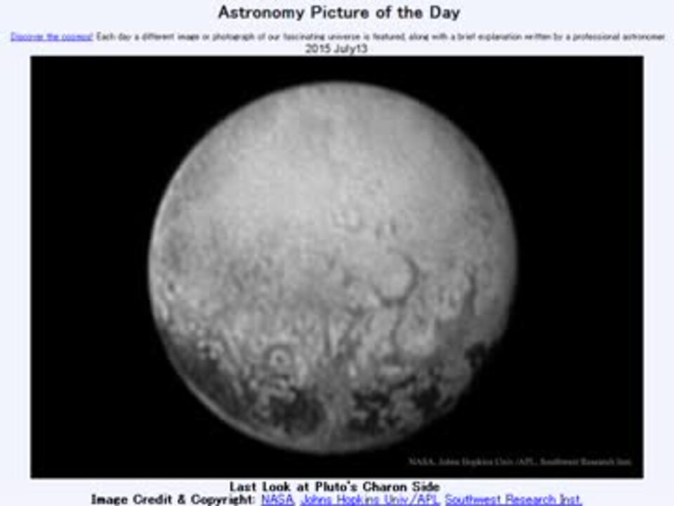 <b>2015年 7月13日 Astronomy Picture of the Day<br />Last Look at Pluto's Charon Side 「冥王星のカロン側の最後の姿」</b><br /><br />APODとはNASAの天文学者が、毎日天文に関する画像に説明を添えて公開しているサイトです。<br />英語の勉強に読んでます。間違いがあれば指摘頂けると嬉しいです。<br /><br /><b>美しい写真と原文</b><br /><a href="http://apod.nasa.gov/apod/ap150713.html" target="_blank" rel="noopener nofollow">http://apod.nasa.gov/apod/ap150713.html</a><br /><b>お借りした音源</b><br /><a href="https://commons.nicovideo.jp/works/nc91337" target="_blank" rel="noopener">nc91337</a>「メイク ア ロケット」 by かずち<br /><br />APODreadingマイリスト <a href="https://www.nicovideo.jp/mylist/32170692" target="_blank" rel="noopener">mylist/32170692</a> (<a href="https://www.nicovideo.jp/watch/sm26880698" class="watch">sm26880698</a><前日 翌日><a href="https://www.nicovideo.jp/watch/sm26888906" class="watch">sm26888906</a>)<br /><br />Twitter:Cc_jabberwock <br /><br />転載はご遠慮下さい。解らない事が有ったら気軽に聞いてみて下さい。調べてきます<br />後2時間ほどで最接近。通信に3時間半かかるため結果は明日明け方とのこと