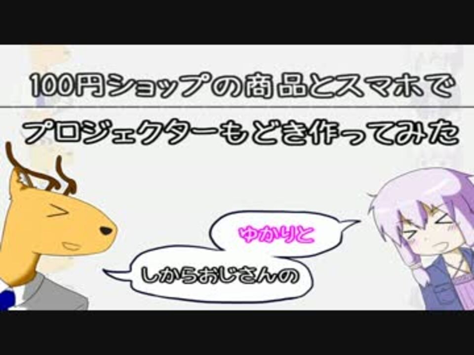 おはこんばんちわ。<br />100円ショップでスマホプロジェクターなるものを発見したので作ってみました<br /><br />内容としては単純ですが、帰省中だったので子供らは大喜びしてました。<br />楽しんでいただけたら幸いです。<br />あと、うちの絵師がおじさんを4コマにしてくれました~。動画最後にて。<br /><br />前回→ <【行ってきた】Maker Faire Tokyo 2015> <a href="https://www.nicovideo.jp/watch/sm27013392" class="watch">sm27013392</a><br />次回→ <【貧乏DIY】ツーバイフォーを柱にして麺打ち台つくってみた><a href="https://www.nicovideo.jp/watch/sm27206295" class="watch">sm27206295</a><br />マイリスト→ <a href="https://www.nicovideo.jp/mylist/51326547" target="_blank" rel="noopener">mylist/51326547</a><br /><br />ブログ→ <a href="http://sikhara-project.hatenablog.jp/" target="_blank" rel="noopener nofollow">http://sikhara-project.hatenablog.jp/</a><br /><br /><注意><br />・ゆっくり音声<br />・結月ゆかり音声<br />・素人編集<br />