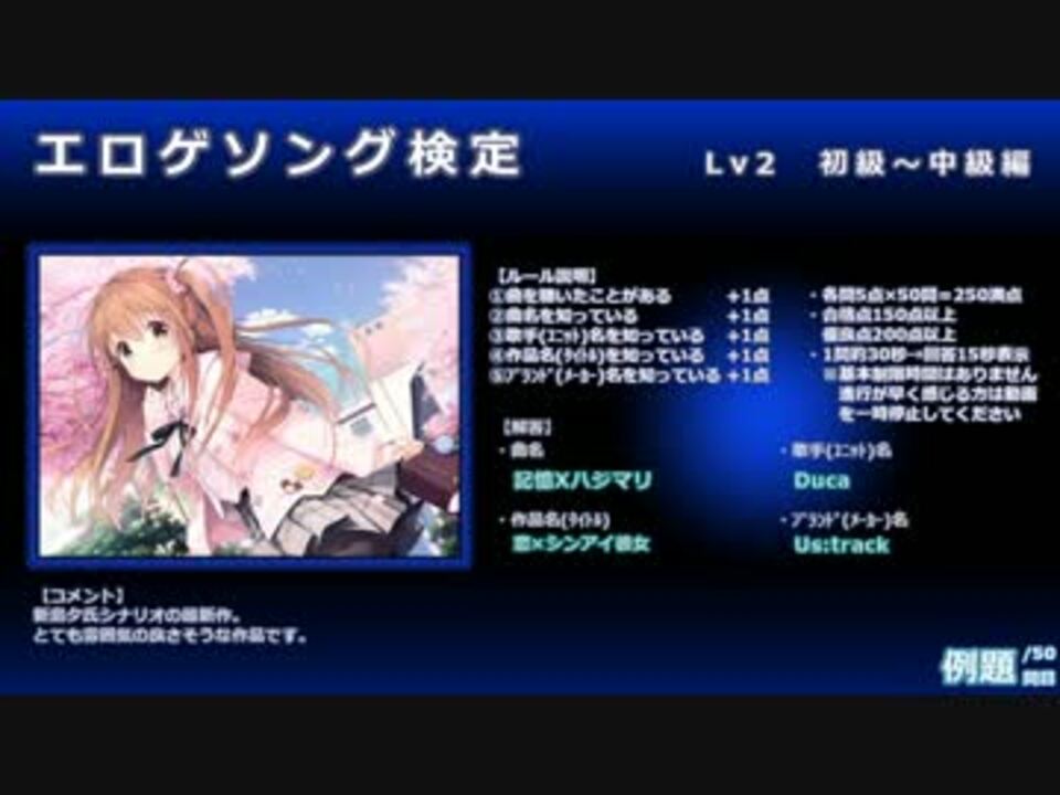 タイトル通りエロゲソングに関する検定です。Lv2初級~中級編になりますが初級より簡単と感じる方もいらっしゃると思います。<br />エロゲ作品の知識も必要となりますのでご注意ください。検定のルールは動画内の説明をご確認ください。<br />正解、不正解の判断はご自身で行ってください。(基準はゆるい方が楽しめるかと思います)<br />非コメ推奨です。<br /><br />【曲だけで参加したい方】<br />基本的なルールは変わりません。①曲を聴いたことがある。②曲名を知っている。③歌手(ユニット)名を知っている。各問3点×50問=150点満点です。合格点90点、優良点120点となります。<br />Level1【初級編】→<a href="https://www.nicovideo.jp/watch/sm27177875" class="watch">sm27177875</a> Level3【中級編】→<a href="https://www.nicovideo.jp/watch/sm27220159" class="watch">sm27220159</a><br />投稿まとめ <a href="https://www.nicovideo.jp/mylist/41237319" target="_blank" rel="noopener">mylist/41237319</a>