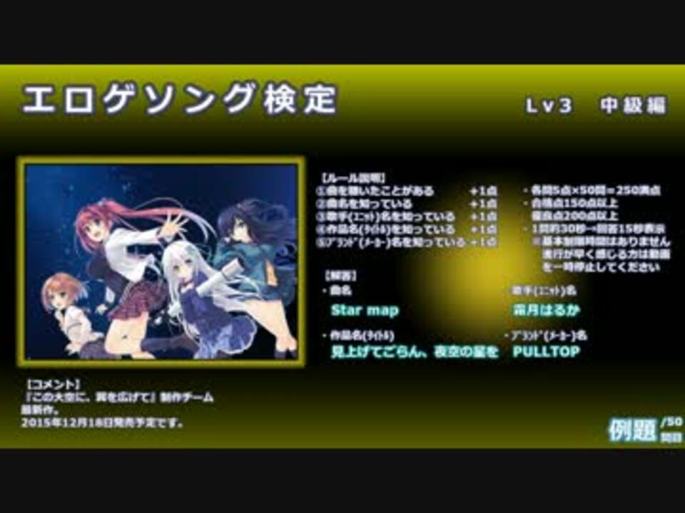 タイトル通りエロゲソングに関する検定です。Lv3中級編になりますが、まだ聴いたことがある曲ばかりだと思います。<br />エロゲ作品の知識も必要となりますのでご注意ください。検定のルールは動画内の説明をご確認ください。<br />正解、不正解の判断はご自身で行ってください。(基準はゆるい方が楽しめるかと思います)<br />非コメ推奨です。<br /><br />【曲だけで参加したい方】<br />基本的なルールは変わりません。①曲を聴いたことがある。②曲名を知っている。③歌手(ユニット)名を知っている。各問3点×50問=150点満点です。合格点90点、優良点120点となります。<br />Level1→<a href="https://www.nicovideo.jp/watch/sm27177875" class="watch">sm27177875</a> Level2→<a href="https://www.nicovideo.jp/watch/sm27193095" class="watch">sm27193095</a> Level4【中級~上級編】→<a href="https://www.nicovideo.jp/watch/sm27277576" class="watch">sm27277576</a><br />投稿まとめ <a href="https://www.nicovideo.jp/mylist/41237319" target="_blank" rel="noopener">mylist/41237319</a>