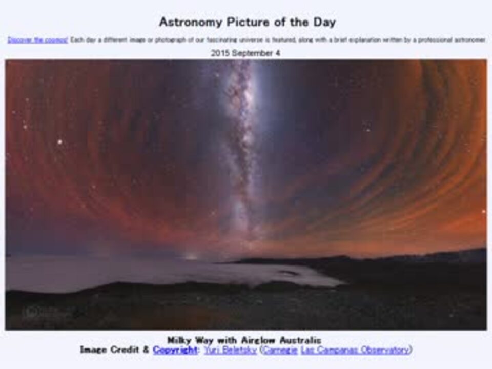 <b>2015年 9月4日 Astronomy Picture of the Day<br />Milky Way with Airglow Australis 「南天の天の川と大気光」</b><br /><br />APODとはNASAの天文学者が、毎日天文に関する画像に説明を添えて公開しているサイトです。<br />英語の勉強に読んでます。間違いがあれば指摘頂けると嬉しいです。<br /><br /><b>美しい写真と原文</b><br /><a href="http://apod.nasa.gov/apod/ap150904.html" target="_blank" rel="noopener nofollow">http://apod.nasa.gov/apod/ap150904.html</a><br /><b>お借りした素材</b><br />Flickrより<br />"Airglow / 大気光" by Noriaki Tanaka<br /><b>お借りした音源</b><br /><a href="https://commons.nicovideo.jp/works/nc103141" target="_blank" rel="noopener">nc103141</a>「雲」 by 瀬良<br /><br />APODreadingマイリスト <a href="https://www.nicovideo.jp/mylist/32170692" target="_blank" rel="noopener">mylist/32170692</a> (<a href="https://www.nicovideo.jp/watch/sm27434093" class="watch">sm27434093</a><前日 翌日><a href="https://www.nicovideo.jp/watch/sm27451364" class="watch">sm27451364</a>)<br /><br />Twitter:Cc_jabberwock <br /><br />転載はご遠慮下さい。解らない事が有ったら気軽に聞いてみて下さい。調べてきます