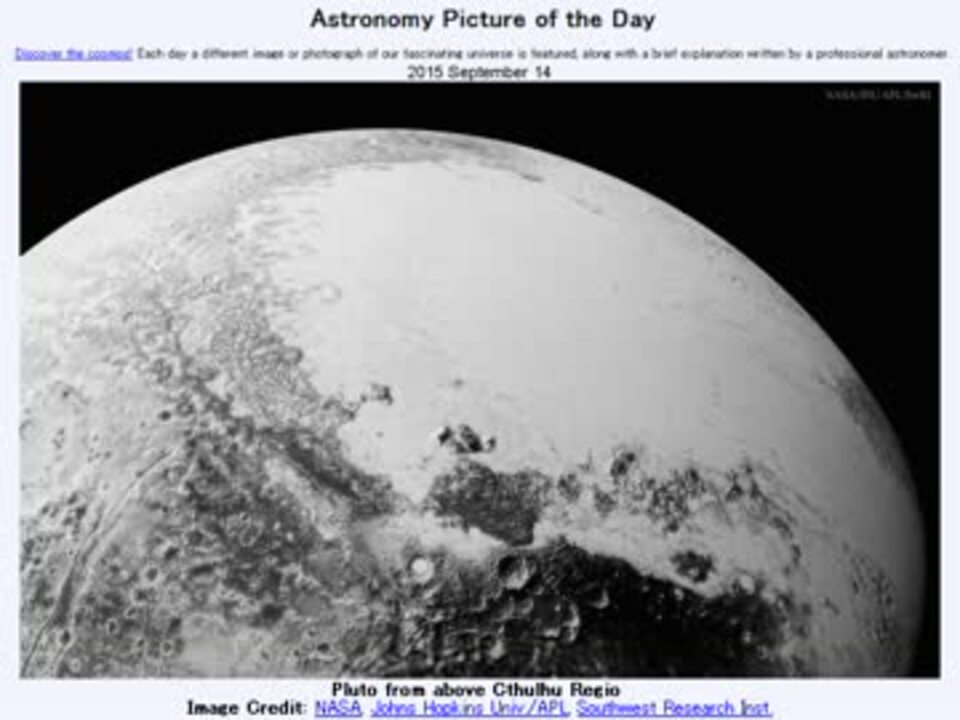<b>2015年 9月14日 Astronomy Picture of the Day<br />Pluto from above Cthulhu Regio 「クトゥルフ領域上空からの冥王星」</b><br /><br />APODとはNASAの天文学者が、毎日天文に関する画像に説明を添えて公開しているサイトです。<br />英語の勉強に読んでます。間違いがあれば指摘頂けると嬉しいです。<br /><br /><b>美しい写真と原文</b><br /><a href="http://apod.nasa.gov/apod/ap150914.html" target="_blank" rel="noopener nofollow">http://apod.nasa.gov/apod/ap150914.html</a><br /><b>お借りした素材</b><br />Flickrより<br />"hide and seek" by 176.9cm<br /><b>お借りした音源</b><br /><a href="https://commons.nicovideo.jp/works/nc96050" target="_blank" rel="noopener">nc96050</a>「希望の残影」 by 秋山裕和<br /><br />APODreadingマイリスト <a href="https://www.nicovideo.jp/mylist/32170692" target="_blank" rel="noopener">mylist/32170692</a> (<a href="https://www.nicovideo.jp/watch/sm27582490" class="watch">sm27582490</a><前日 翌日>)<br /><br />Twitter:Cc_jabberwock <br /><br />転載はご遠慮下さい。解らない事が有ったら気軽に聞いてみて下さい。調べてきます