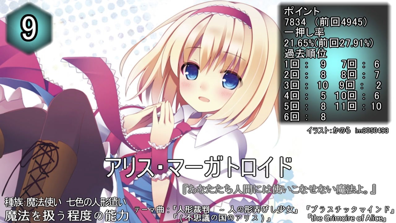 2016年1月10日~16日に開催された人気投票結果を動画化。<br>リスペクト元→<a href="https://www.nicovideo.jp/watch/sm26388801" class="watch">sm26388801</a><br><br>マモレナカッタ…(遅いけど)せっかく作ったのでアップしました<br><br>詳細は公式にてどうぞ!→<a href="http://tohovote12.b12.coreserver.jp/" target="_blank" rel="noopener nofollow">http://tohovote12.b12.coreserver.jp/</a><br>Twitter→<a href="https://twitter.com/The_ryu2525" target="_blank" rel="noopener nofollow">https://twitter.com/The_ryu2525</a><br>前回出した奴→<a href="https://www.nicovideo.jp/watch/sm26396939" class="watch">sm26396939</a><br><br>追記<br>あ!!100位が順位タイで2人いたの見逃してました、本当にごめんなさい。<br>100位に『九十九八橋』ちゃんもいます、ファンに殺されるゥ!<br><br>そして早すぎた別動画の人様→<a href="https://www.nicovideo.jp/watch/sm28052888" class="watch">sm28052888</a>
