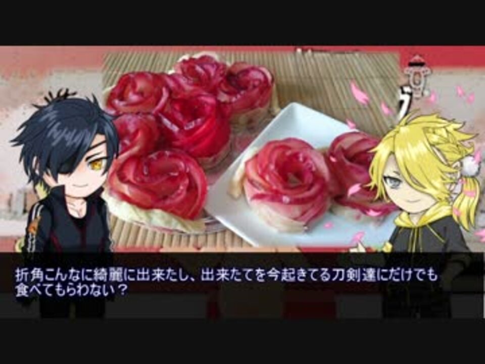 ししおー「本当に俺がこんなに食って良いのか?」<br />ぴかぴー「勿論だよ。」<br />ぎねぴー <b><font size="4"> ≫食い物の気配を察知≪ </font></b><br /><font size="1"> 300度のくだりは本当にやりました。ふじりんごちゃんごめんな(´・ω,';,';,',<br />見た目ほど味が変わってなかったのがせめてもの救いでした…</font><br /><br />第一回とうらぶ料理祭開催おめでとうございます!!<br />主催 :のら様→ 【<a href="https://www.nicovideo.jp/watch/sm27934257" class="watch">sm27934257</a>】<br />副主催:すいる様→【<a href="https://www.nicovideo.jp/watch/sm27934626" class="watch">sm27934626</a>】<br /> しのめ→ 【<a href="https://www.nicovideo.jp/watch/sm27964458" class="watch">sm27964458</a>】<br /><br />* メニュー : ローズパイ<br />* 担当刀剣 : 燭台切光忠、獅子王<br /><br />今回から阿僧祇様(@asougi09)の描かれた立ち絵を使用させていただいています。<br /><br />前←<a href="https://www.nicovideo.jp/watch/sm27621484" class="watch">sm27621484</a> 【mylist→<a href="https://www.nicovideo.jp/mylist/53900709" target="_blank" rel="noopener">mylist/53900709</a>】 後→<a href="https://www.nicovideo.jp/watch/sm28178860" class="watch">sm28178860</a><br /><br />* Twitter : @shinome_nico2