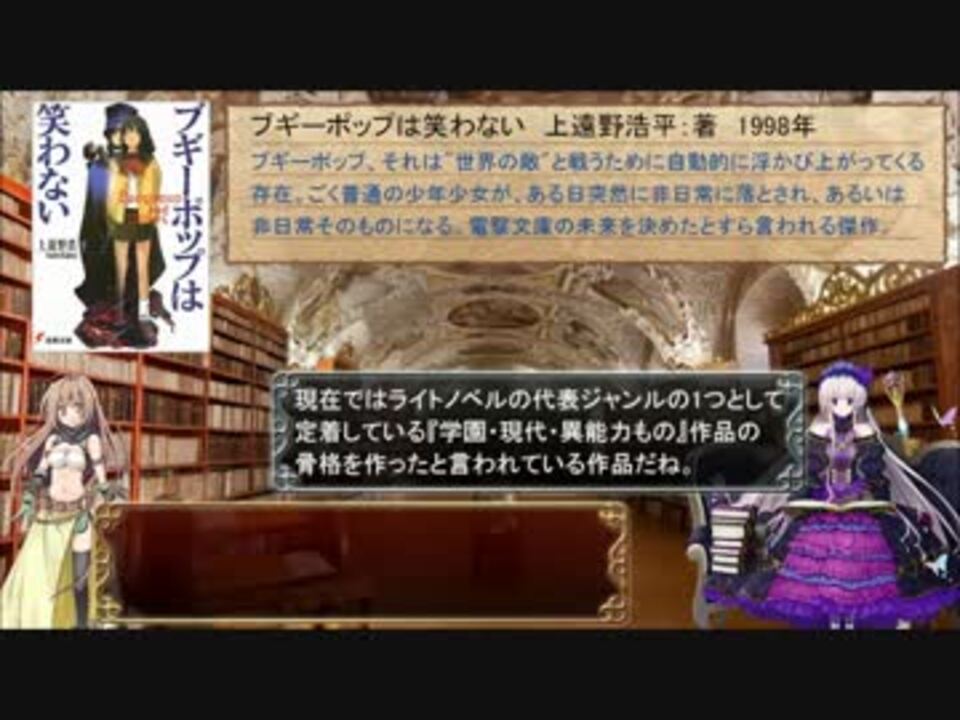 ライトノベルの歴史を年代順に紹介していく予定の動画です。<br />UP主は専門家・研究家ではなく、ただのラノベも含む本好きです。<br /><br /><br />※ナビゲーターとして「千年戦争アイギス」というゲームのキャラを使用していますが、アイギス要素はありません。<br /><br /><br />びたちー素材館様(<a href="http://www.vita-chi.net/sozai1.htm)のウィンドウ素材を使用しています" target="_blank" rel="noopener nofollow">http://www.vita-chi.net/sozai1.htm)のウィンドウ素材を使用しています</a>。<br /><br /><br />※ガバ編集で、一部著者名表記がおかしなことになってますorz<br /> 狂科学ハンターREIの著者は中里融司氏です。ご指摘感謝。<br />※広告を頂きました。深く感謝。<br /><br /><br />#4 ・<a href="https://www.nicovideo.jp/watch/sm28244616" class="watch">sm28244616</a> #6 ・<a href="https://www.nicovideo.jp/watch/sm28589448" class="watch">sm28589448</a><br />・マイリスト <a href="https://www.nicovideo.jp/mylist/54411992" target="_blank" rel="noopener">mylist/54411992</a>