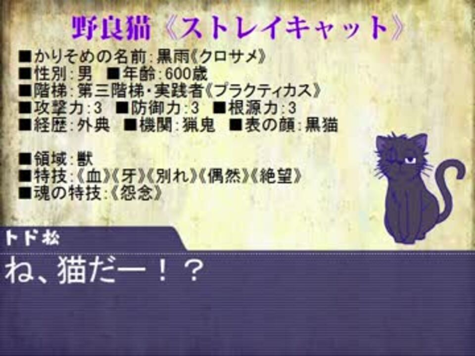 新たな物語の幕が上がる(一方トッティは胃痛を感じていた)<br /><br />■おそ松さんはもう最終回間近ですが、前作「静寂と孤独のマギカロギア」に続くキャンペーンシリーズをこっそり始めさせて頂こうと思います。拙作ですがお付き合い頂ければ<br />■るるぶ2巻「幻惑のノスタルジア」及びア○ラスの悪魔召喚ゲーを参考にシナリオを作成しております。時代知識はwiki先生頼りなので広い心で見てくださると幸いです(服装知識も貧弱なので三人中二人の衣装が元ネタを参考に描いてもらった物となります)<br />■おそ松兄さんの言うコンセプトは(仮)くらいに受け止めておいて下さい<br />■<font color="red">実際の史実、及び国とは全く関係御座いません。ご了承下さい</font><br /><br /><br />■前作の初回 <a href="https://www.nicovideo.jp/watch/sm27924458" class="watch">sm27924458</a> ■次はまだ ■マイリス <a href="https://www.nicovideo.jp/mylist/55345877" target="_blank" rel="noopener">mylist/55345877</a>