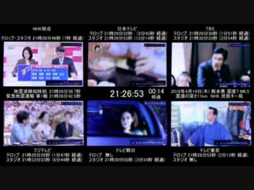 2016年4月14日の木曜日に熊本県で発生したマグニチュード6.5(震度7)の地震で、<br />日本の主要なテレビ放送局の6局で地震速報テロップと緊急報道特別番組が、<br />テレビ局に表示されるまでの経過時間を比較検証した動画です。<br /><br />左上から<br />●NHK総合 ●日本テレビ(日テレNTV) ●TBS<br />●フジテレビ(CX)●テレビ朝日(テレ朝EX) ●テレビ東京(テレ東TX) <br /><br />この地震で九州地方に大津波警報・津波警報・津波注意報なし<br />川内原発(鹿児島)玄海原発(佐賀県)伊方原発(愛媛県)の原子力発電所に異常なし<br /><br />●震度7は4例しかありません<br />・1995年01月17日 兵庫県南部地震(阪神・淡路大震災)<br />・2004年10月23日 新潟県中越地震 新潟県川口町<br />・2011年03月11日 東北地方太平洋沖地震 宮城県栗原市<br />・2016年04月14日 熊本地震 熊本県益城町