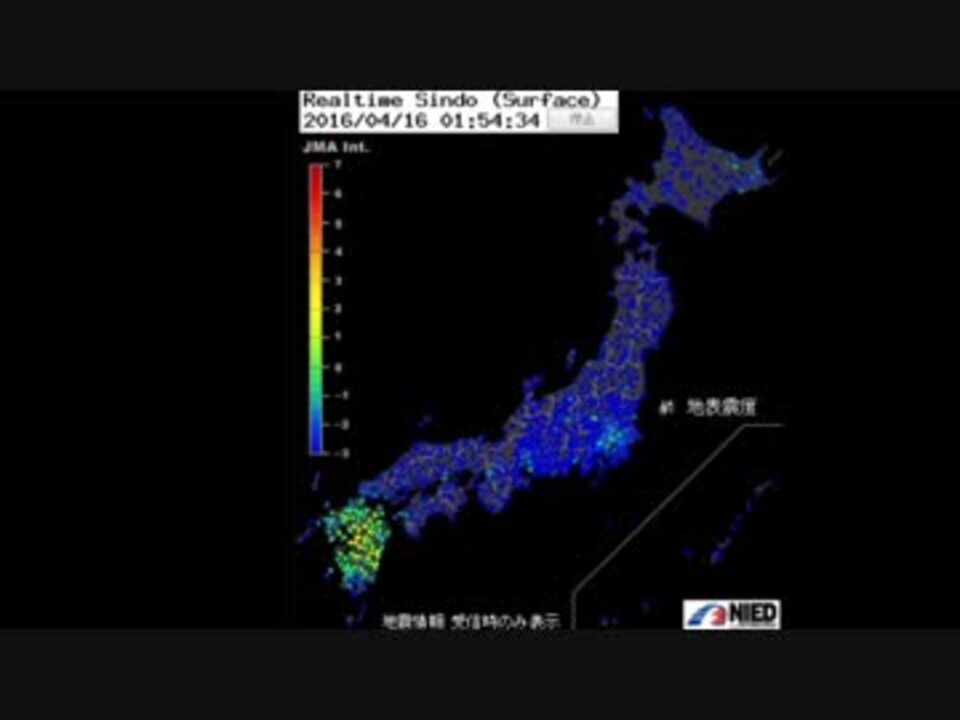 前回 4月14日(木)21時26分頃 震度7マグニチュード6.5(<a href="https://www.nicovideo.jp/watch/sm28640061" class="watch">sm28640061</a>)<br />今回 4月16日(土)1時25分頃 震度6強<b>マグニチュード7.3</b><br /><br />違いがよく分かります<br /><br /><br />強震モニタ<br /><a href="http://www.geocities.jp/kwatch_24h/2sec_multi.html" target="_blank" rel="noopener nofollow">http://www.geocities.jp/kwatch_24h/2sec_multi.html</a><br />