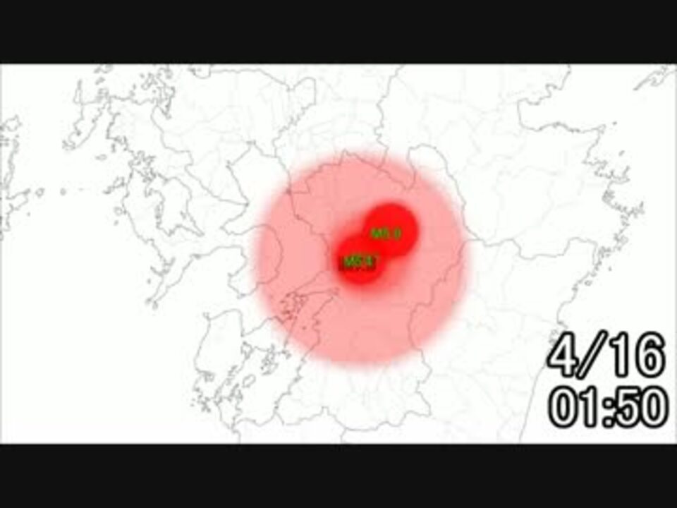熊本地震の前震・本震・余震の推移を地図で可視化してみました。音量注意です。<br />震度1以上を観測した地震を取り扱っています。<br />データは気象庁から(<a href="http://www.jma.go.jp/jma/index.html)" target="_blank" rel="noopener nofollow">http://www.jma.go.jp/jma/index.html)</a><br />M4.5以上から、地震のマグニチュードを表示しています。