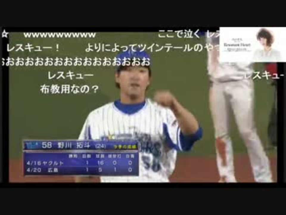 <br /><font size="6"><font color="blue">No.58、No.58!! TAKUTO☆NOGAWA</font></font><br /><br />毎度ニコ生より、コメ付<br /><br />無事ハマスタ二戦目、3奪三振で無事レスキュー、試合結果…?<br />初戦より生放送コメ、レスキューコールは増えましたね、登場のワクワク感は減りました。<br />実況が増えましたが、サビも入って痛々しいコールも増えたので一応ここまで。<br />ギミレボは<a href="#" class="seekTime" data-seekTime="0:30" onclick="seekNicoPlayer('#0:30'); return false;">#0:30</a>あたりから<br /><br />前→<a href="https://www.nicovideo.jp/watch/sm28676230" class="watch">sm28676230</a><br />次→<a href="https://www.nicovideo.jp/watch/sm28730310" class="watch">sm28730310</a><br /><font color="blue">レスキュー練習用→<a href="https://www.nicovideo.jp/watch/sm28724631" class="watch">sm28724631</a></font><br />一覧→<a href="https://www.nicovideo.jp/mylist/55721873" target="_blank" rel="noopener">mylist/55721873</a>