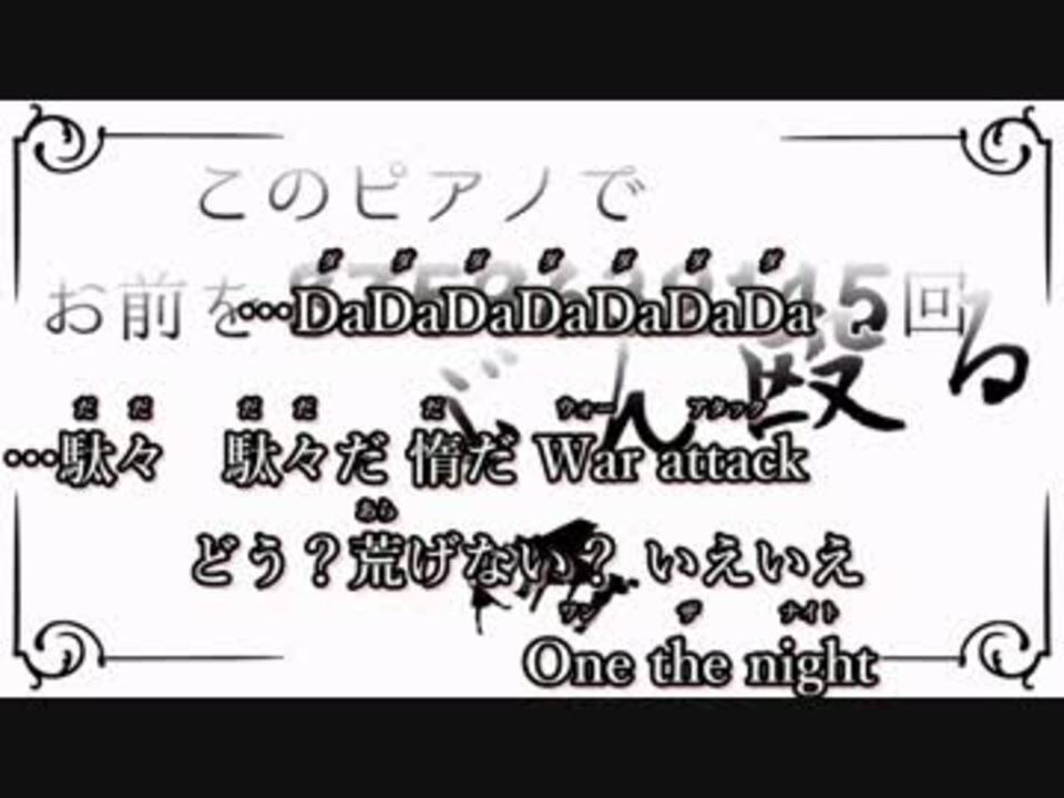SLAVE.V-V-R(<a href="https://www.nicovideo.jp/user/45013355" target="_blank" rel="noopener">user/45013355</a>) 様の『このピアノでお前を8759632145回ぶん殴る』のニコカラです。<br /><br />本家様 ... <a href="https://www.nicovideo.jp/watch/sm28714955" class="watch">sm28714955</a><br /><br />・上字幕(空耳英語) 下字幕(本歌詞)<br />・英語字幕は本家動画様の紫コメント(5/5時点)を参考にさせて頂いています。<br />・英語のルビは英単語の発音となります。個人で流暢に歌ってください()<br /><br />字幕不具合点<br />※2:07~2:09 , 2:13の[Take]の後ろのルビがズレます<br />※3:39 , 字幕が被ります<br /><br />予めご了承ください。<br /><br />↓よろしければどぞ↓<br /><br />Off vocal ... <a href="https://www.nicovideo.jp/watch/sm28780264" class="watch">sm28780264</a><br /><br />On vocal(修正&pink2空耳版) ... <a href="https://www.nicovideo.jp/watch/sm28883156" class="watch">sm28883156</a> <b><font color="red">出しました</font></b><br />Off vocal(修正&pink2空耳版) ... <a href="https://www.nicovideo.jp/watch/sm28883286" class="watch">sm28883286</a><br /><br />マイリスト(On vocal) ... <a href="https://www.nicovideo.jp/mylist/55740140" target="_blank" rel="noopener">mylist/55740140</a><br />マイリスト(Off vocal) ... <a href="https://www.nicovideo.jp/mylist/55740164" target="_blank" rel="noopener">mylist/55740164</a>